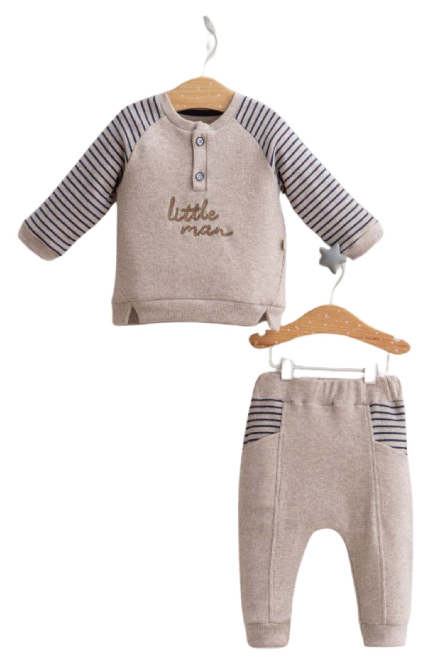 Önden düğmeli tasarımı ve kollarındaki çizgileriyle hem şık hem de pratik olan bu erkek bebek takımı, bebeğinizin günlük hayatındaki en yakın arkadaşı olacak.