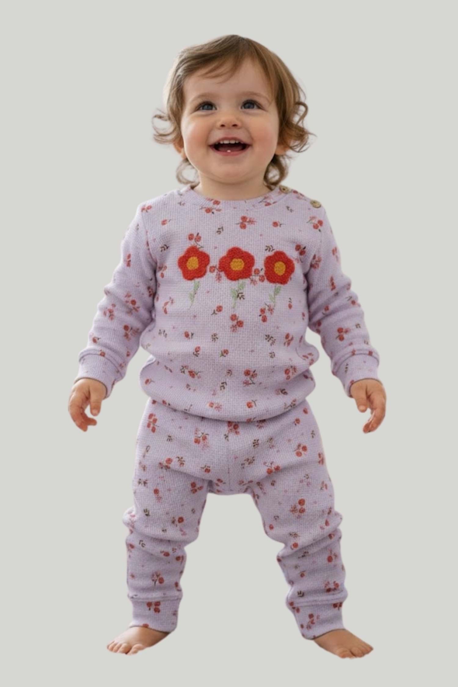 Çiçek Baskılı Takma Büzgülü Yaka Enseden Düğmeli Kız Takım - Pudra - 18-24 AY