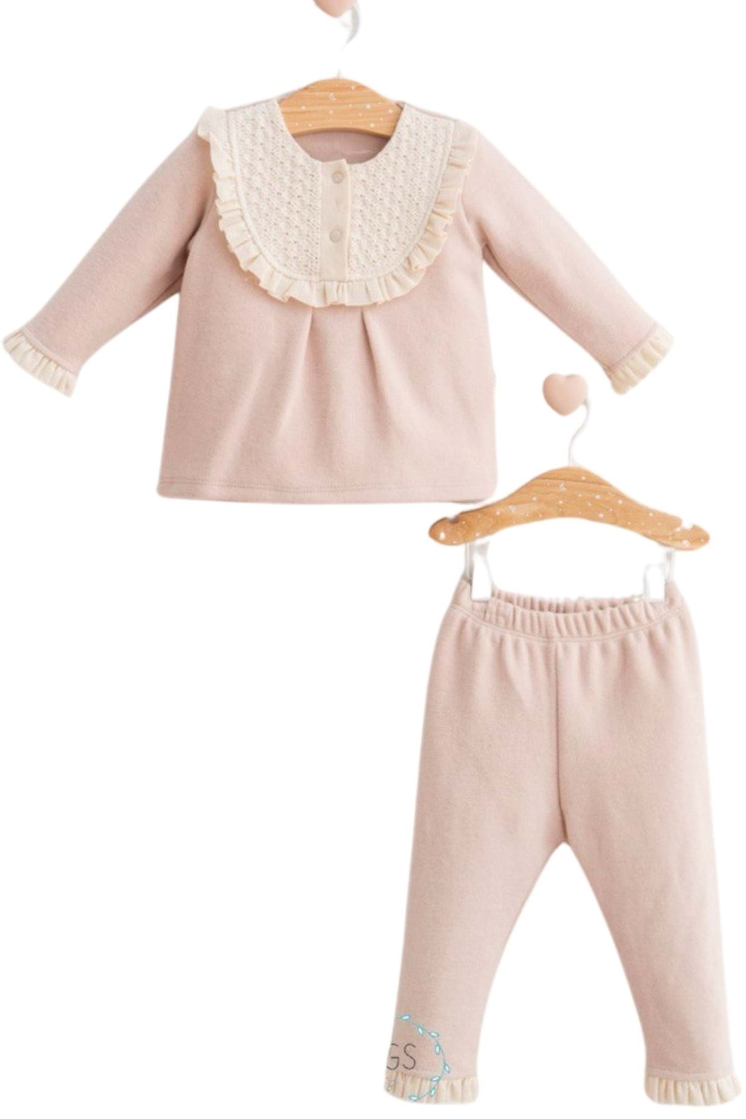 İnce fitilli kadifenin yumuşak dokusu ve zarif güpür detaylarının bir araya geldiği bu takım, kız bebeğinizin kış aylarındaki en şık ve rahat kıyafetlerinden biri olacak. Hem özel günlerde hem de günlük hayatta kullanılabilecek bu takım, bebeğinizin dolabında mutlaka bulunması gerekenlerden.