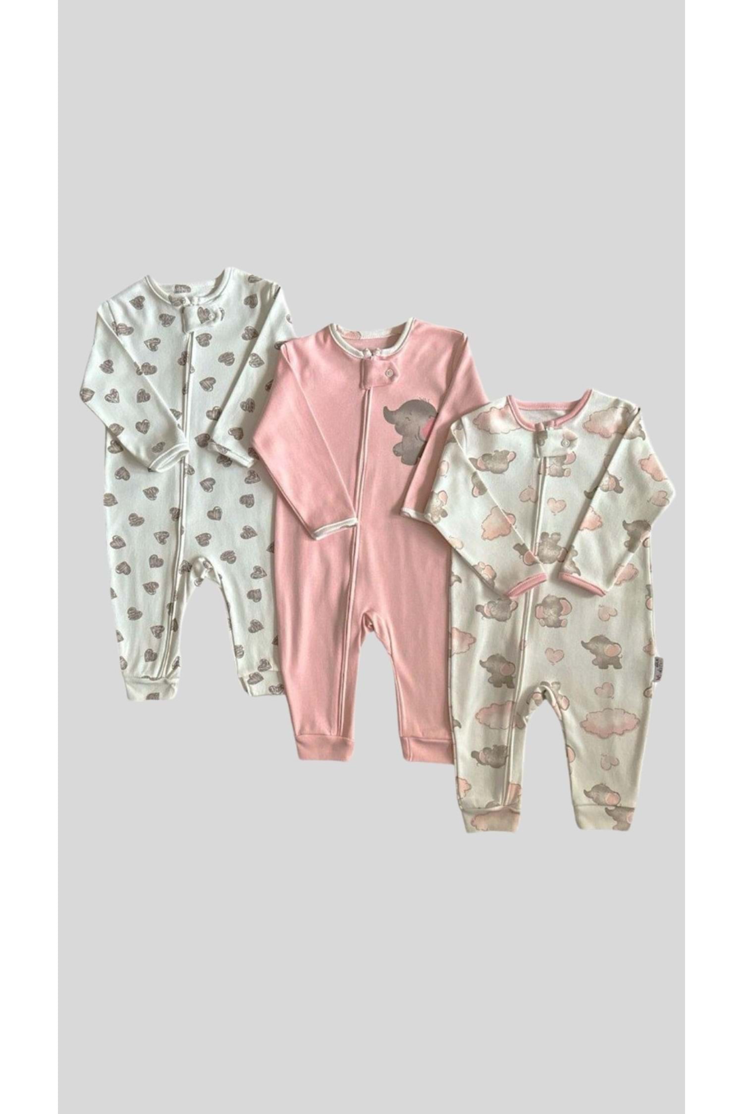 Kalp Baskılı Çıtçıt Kapamalı Patikli 3lü Kız Bebek Tulum - Ekru-Bej-Pembe
