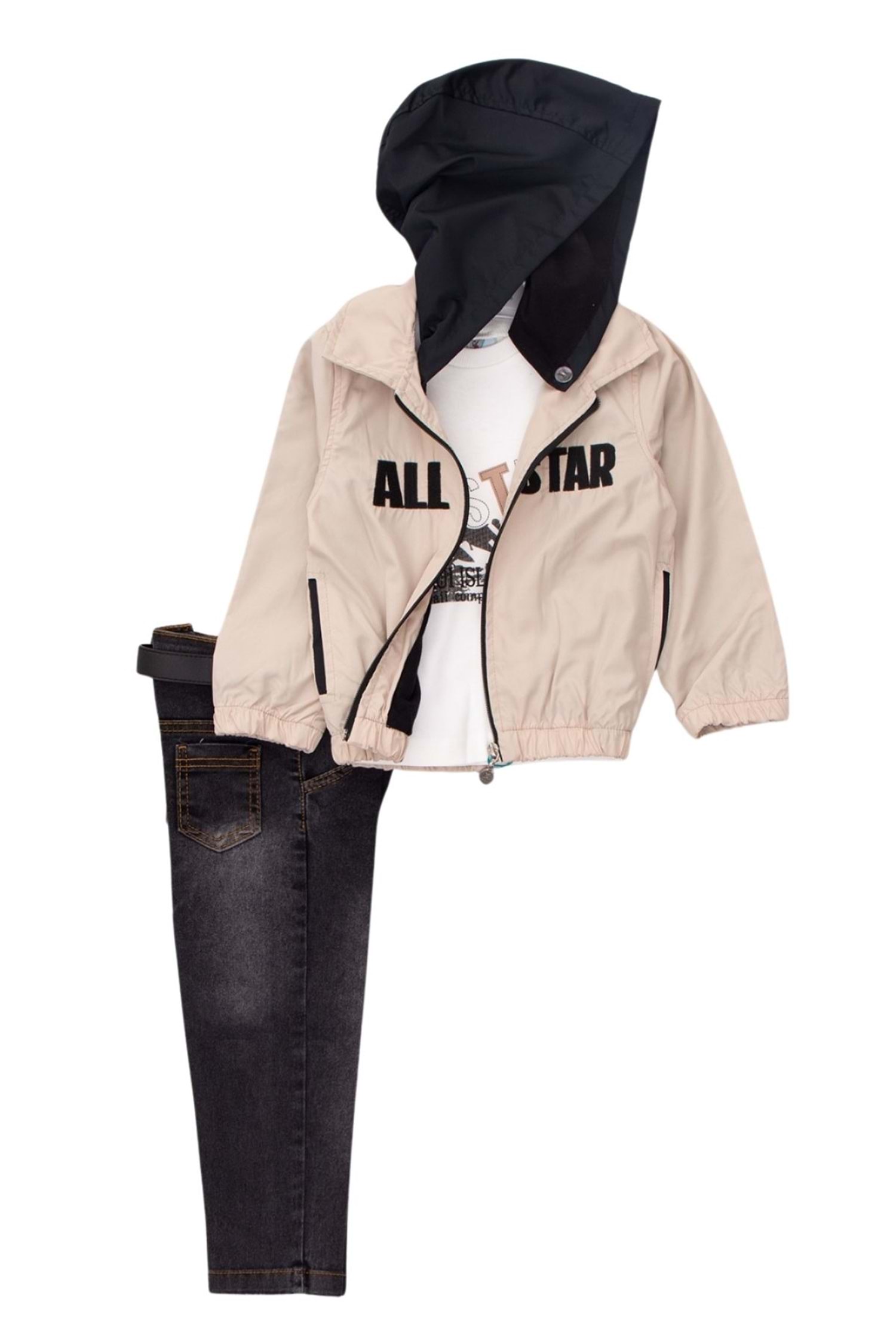 Baskılı T-Sihirt Kot Ceket Kot Pantolonlu Erkek Çocuk 3lü Takım - Bej