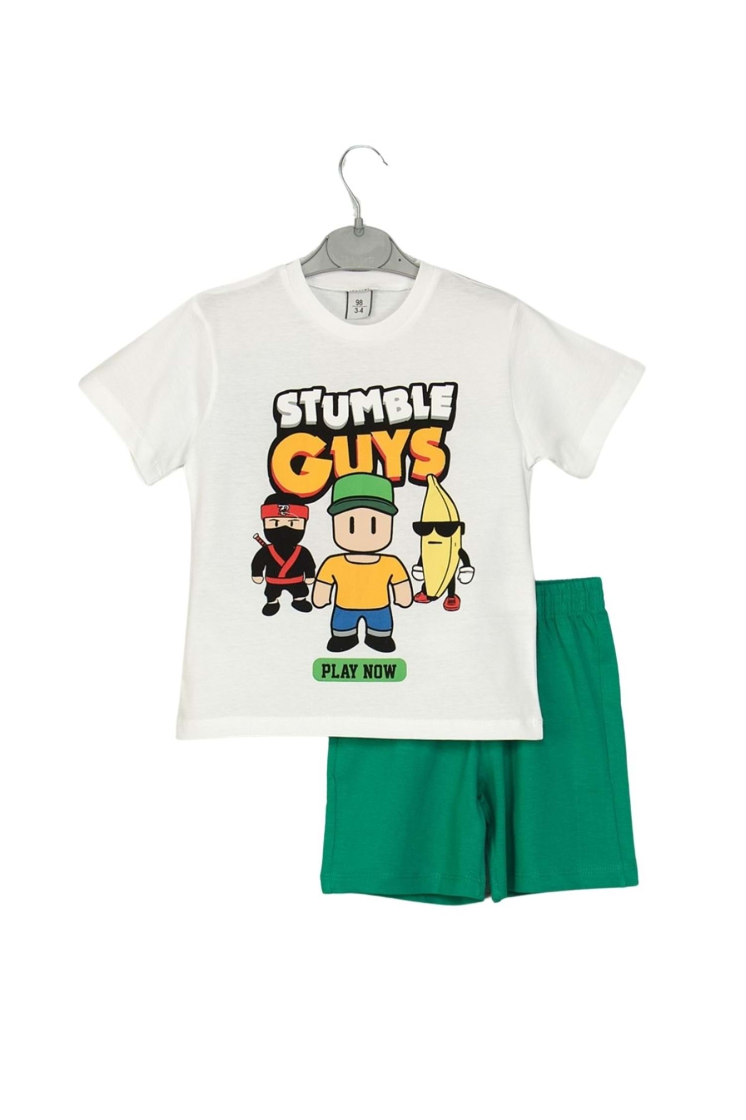 Minik oyun tutkunlarının yaz maceralarında rahatlık ve eğlenceyi bir arada yaşamasını sağlayacak, Waka Waka Kids Store'da bulabileceğiniz bu Stumble Guys baskılı erkek çocuk tişört ve şort takımı ile tanışın! Yumuşak ve nefes alan pamuklu kumaşı sayesinde çocuğunuzun gün boyu konforlu hissetmesini sağlar ve hareket özgürlüğü sunar. Beyaz tişörtün üzerindeki popüler "Stumble Guys" karakterlerinin eğlenceli baskısı ve "Play Now" yazısı, miniklerin favorisi olacak. Canlı yeşil renkteki rahat şortuyla tamamlanan bu takım, sıcak havalarda maksimum konfor sağlarken, oyun parkında, tatilde veya günlük kullanımda fark yaratır. Spor ayakkabılarla kolayca kombinlenebilen bu eğlenceli takım, Waka Waka Kids Store'un özenle seçtiği ürünler arasında yer alıyor!