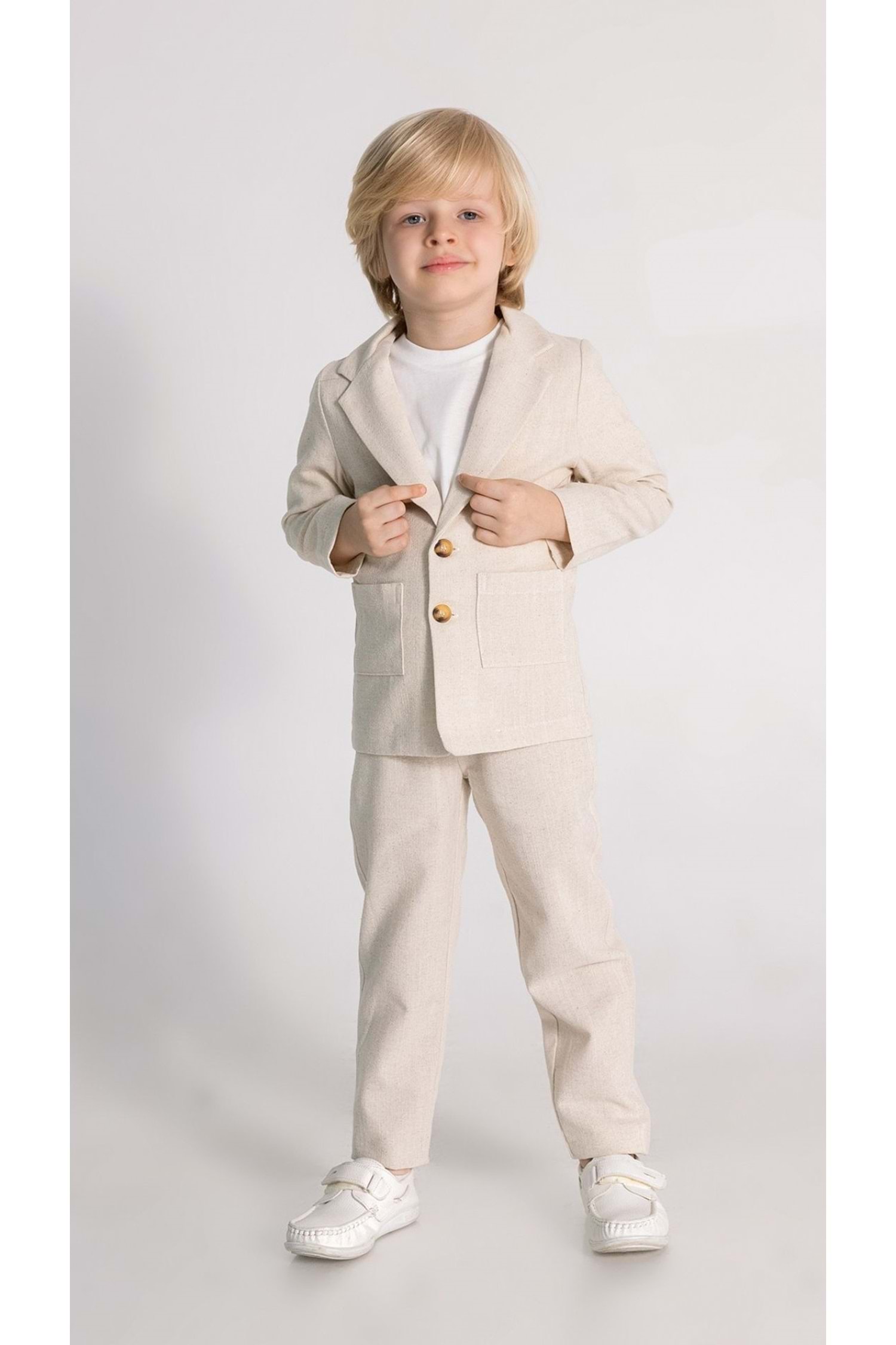 Çizgili ceketli, iç astarlı keten erkek çocuk 3'lü takımı, hem özel günler hem de günlük kullanım için ideal bir seçenektir. Bu takım, çocuğunuzun hem rahat etmesini hem de şık görünmesini sağlar.