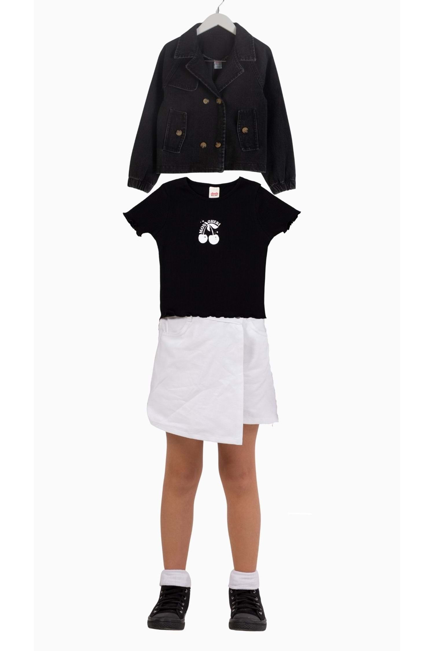 Bu sevimli ve şık takım, minik modacıların gardırobuna hem rahatlık hem de modern bir hava katacak! Kiraz baskılı tişörtün canlı renkleri, önden yırtmaçlı şort eteğin rahatlığı ve crop düğme kapamalı kot ceketinin cool tarzı bir araya gelerek harika bir kombin oluşturuyor.