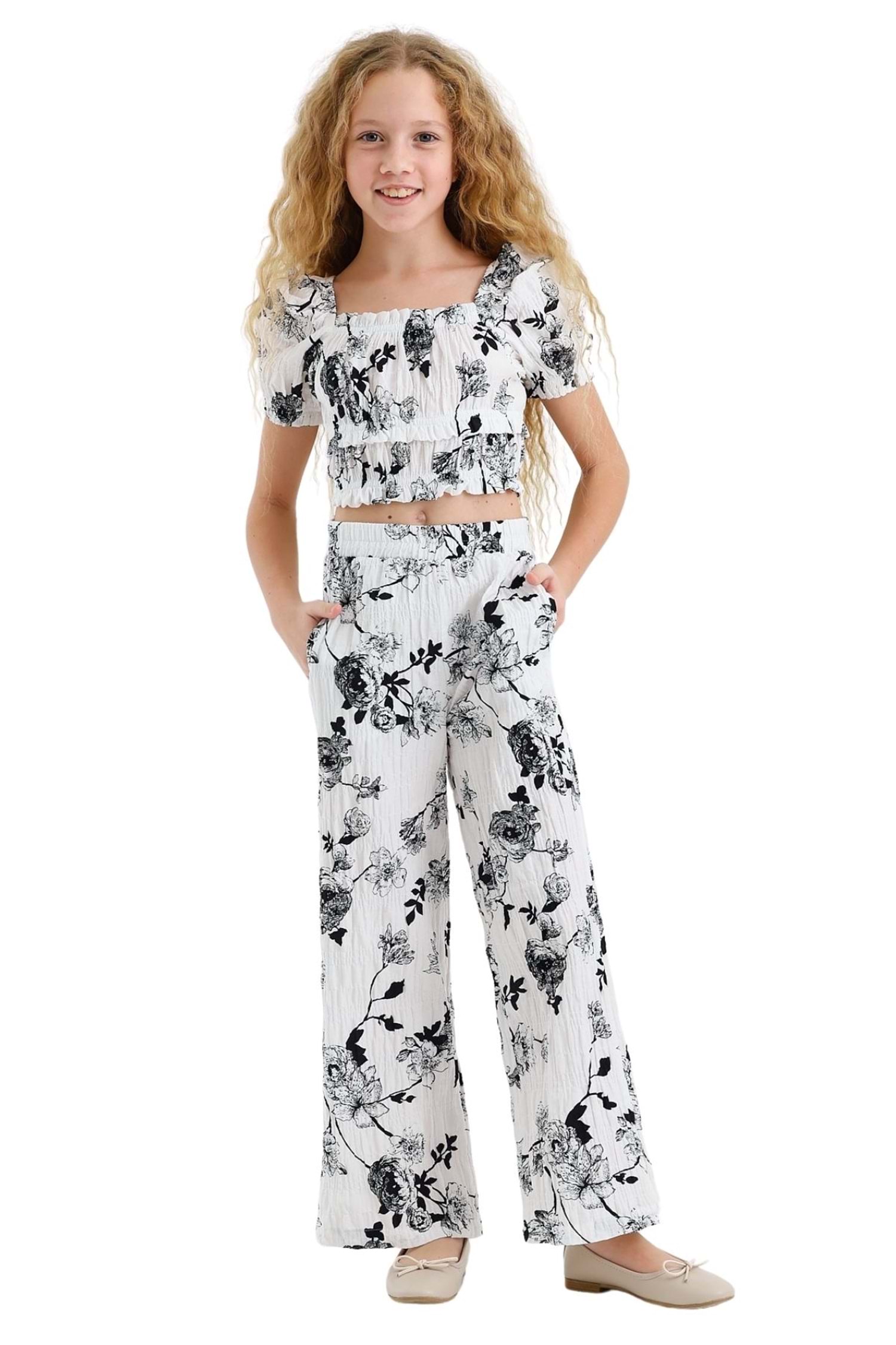 Gençlerin zarif ve stil sahibi görünümü için Waka Waka Kids Store'da bulabileceğiniz bu siyah beyaz çiçek desenli kız çocuk crop top ve bol paça pantolon takım ile tanışın! Trend kare yakalı, kısa kollu crop top bluzun şık siyah beyaz çiçek deseni ile çocuğunuzun günlük veya özel gün kombinlerine zarif bir dokunuş katarken, uyumlu yüksek belli bol paça pantolonu rahatlığı ve şıklığı bir arada sunar. Yumuşak ve hafif kumaşı sayesinde gün boyu konforlu bir kullanım sağlar. İster özel davetlerde, ister şık günlük kombinlerde, bu trend ve rahat takım gençlerin favori parçası olacak. Pantolonun yan cepleri kullanışlılık sunar.