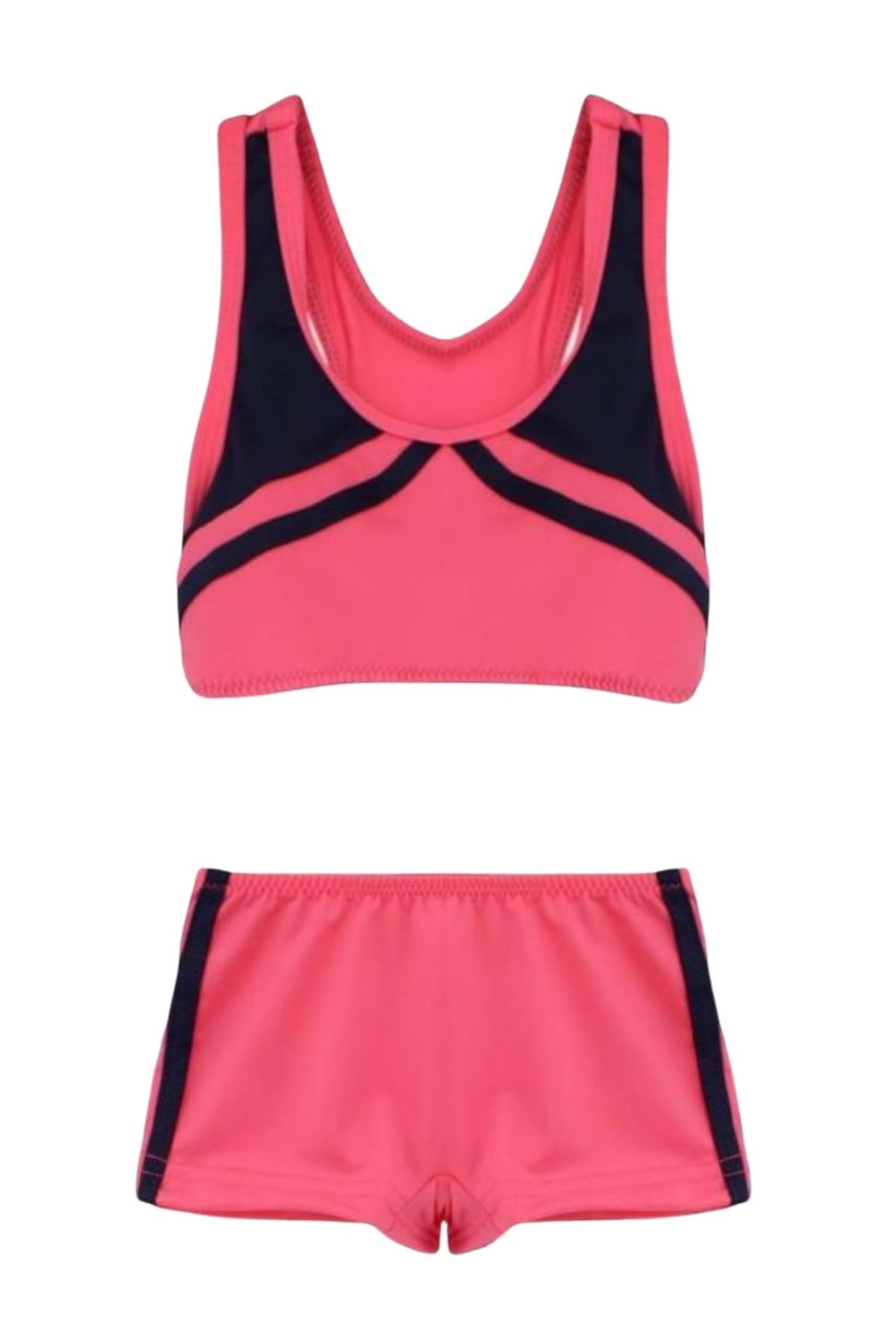 Aktif gençlerin su keyfini doyasıya çıkarabileceği, Waka Waka Kids Store'da bulabileceğiniz bu blok renkli pembe ve lacivert şortlu kız çocuk bikini takımı ile tanışın! Trend pembe ve lacivert renk blokları ile sportif ve dinamik bir görünüm sunarken, rahat kesimli üst ve şort altı hareket özgürlüğü sağlar. Yumuşak ve çabuk kuruyan kumaşı sayesinde konforlu bir kullanım sunar. Sabit askıları ve kolay giyilebilir tasarımı ile pratik bir seçenektir. İster havuzda, ister denizde, bu sportif ve rahat şortlu bikini takımı gençlerin favorisi olacak.