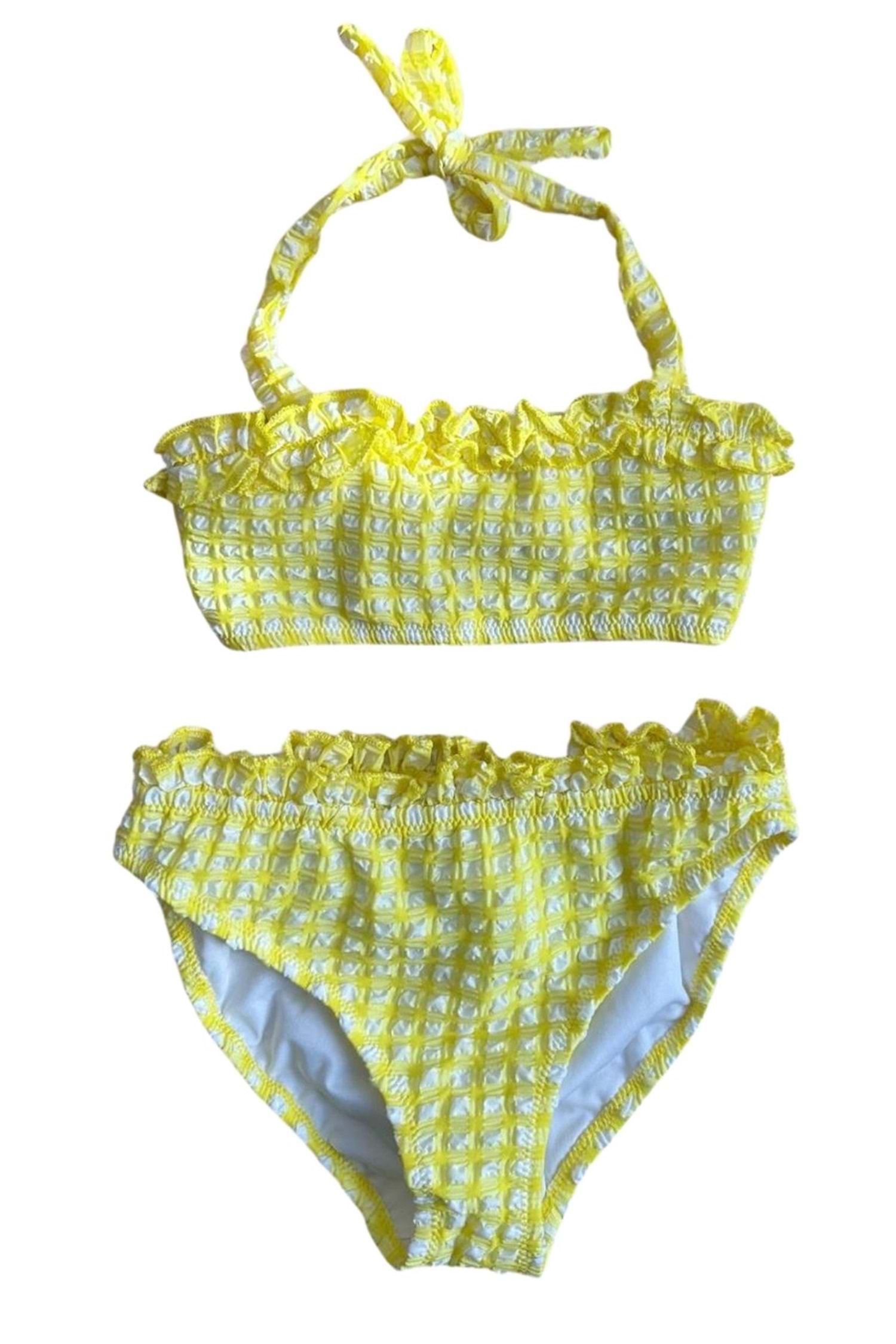 Miniklerin yaz enerjisini yansıtacak, Waka Waka Kids Store'da bulabileceğiniz bu kare desenli fırfırlı sarı kız çocuk bikini takımı ile tanışın! Trend canlı sarı rengi ve sevimli kare deseni ile çocuğunuzun deniz ve havuz keyfine neşe katarken, üst ve alt kısımlarındaki şık fırfır detayları tatlı bir görünüm sunar. Bağlamalı askıları sayesinde kolayca ayarlanabilir ve rahat kesimi hareket özgürlüğü sağlar. Çabuk kuruyan ve yumuşak kumaşı ile konforlu bir kullanım sunar. İster havuzda, ister denizde, bu sevimli ve enerjik bikini takımı miniklerin favorisi olacak.