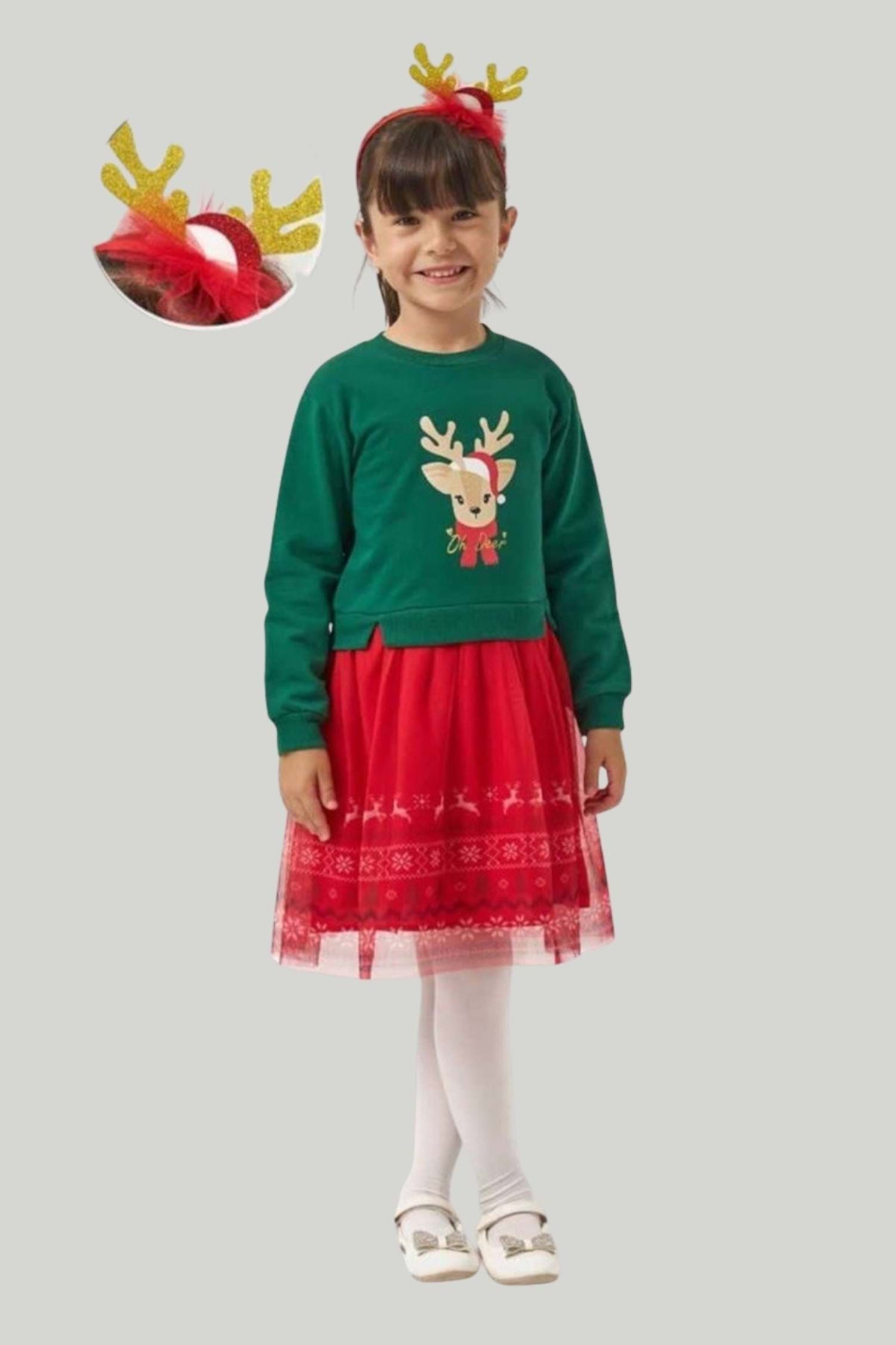 Kış ve Yılbaşı Teması: Canlı yeşil rengi ve sevimli Noel şapkalı geyik (geyik) baskısıyla tatil ruhunu yansıtır. (Noel Temalı Kıyafet, Geyik Desenli)