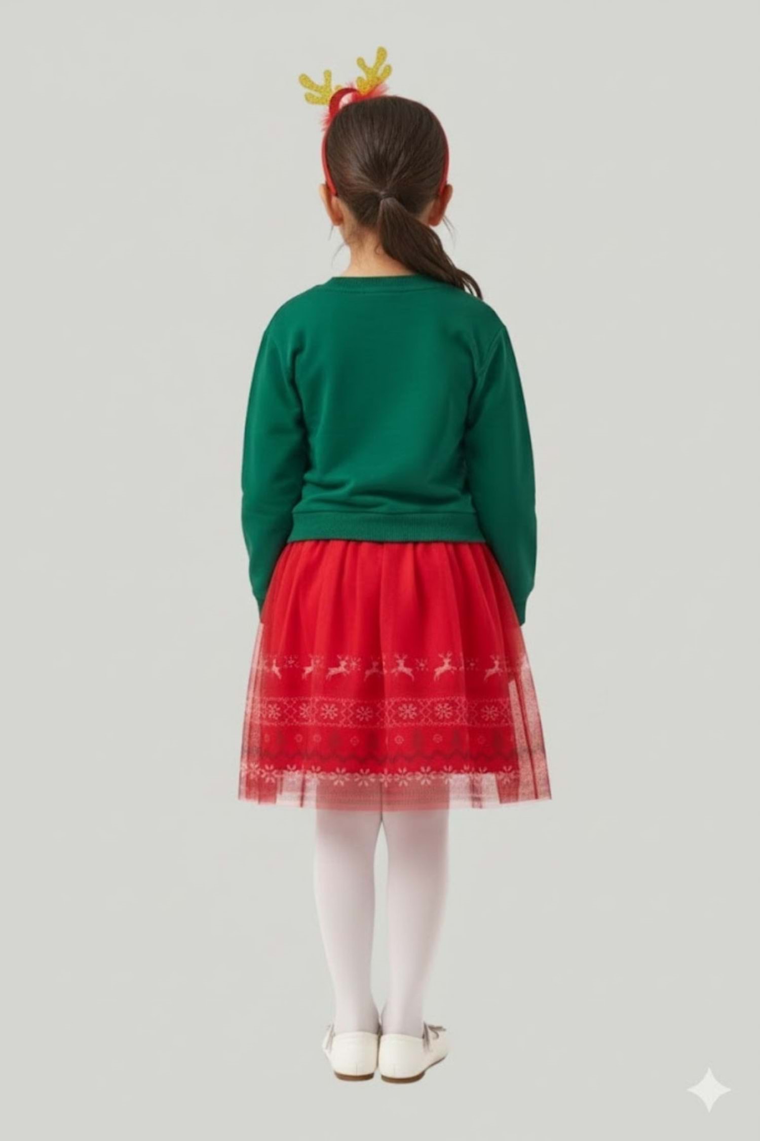 Katmanlı Tül Etek: Kırmızı renkteki pofuduk tül etek, kar tanesi ve kış desenleriyle süslenmiştir. Elbiseye hareketli ve şık bir görünüm katar. (Tütü Etekli Çocuk Elbisesi)