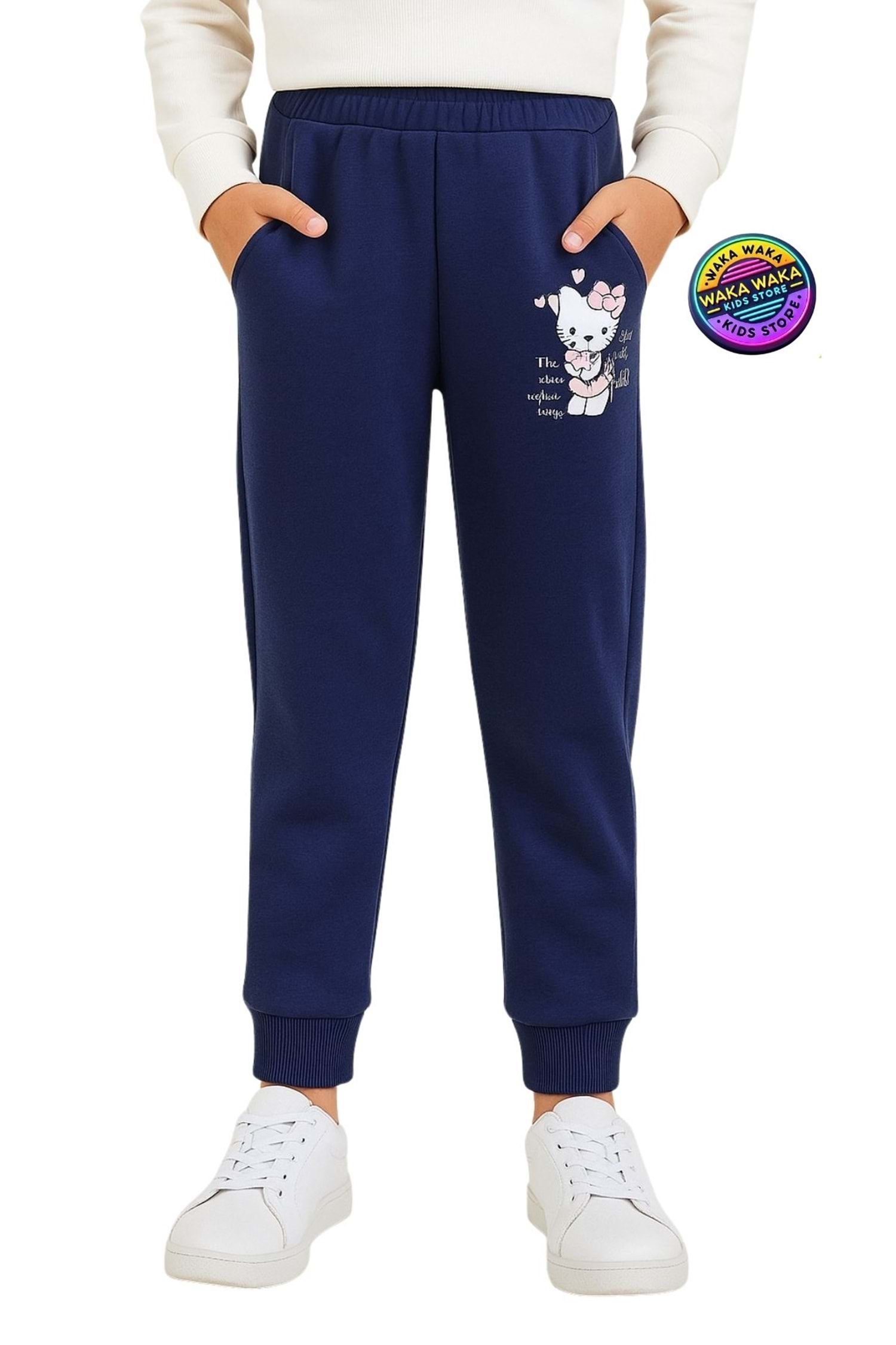 Cep Üstü Baskılı Beli Lastikli Paçaları Ribanalı Kız Çocuk Eşofman Alt