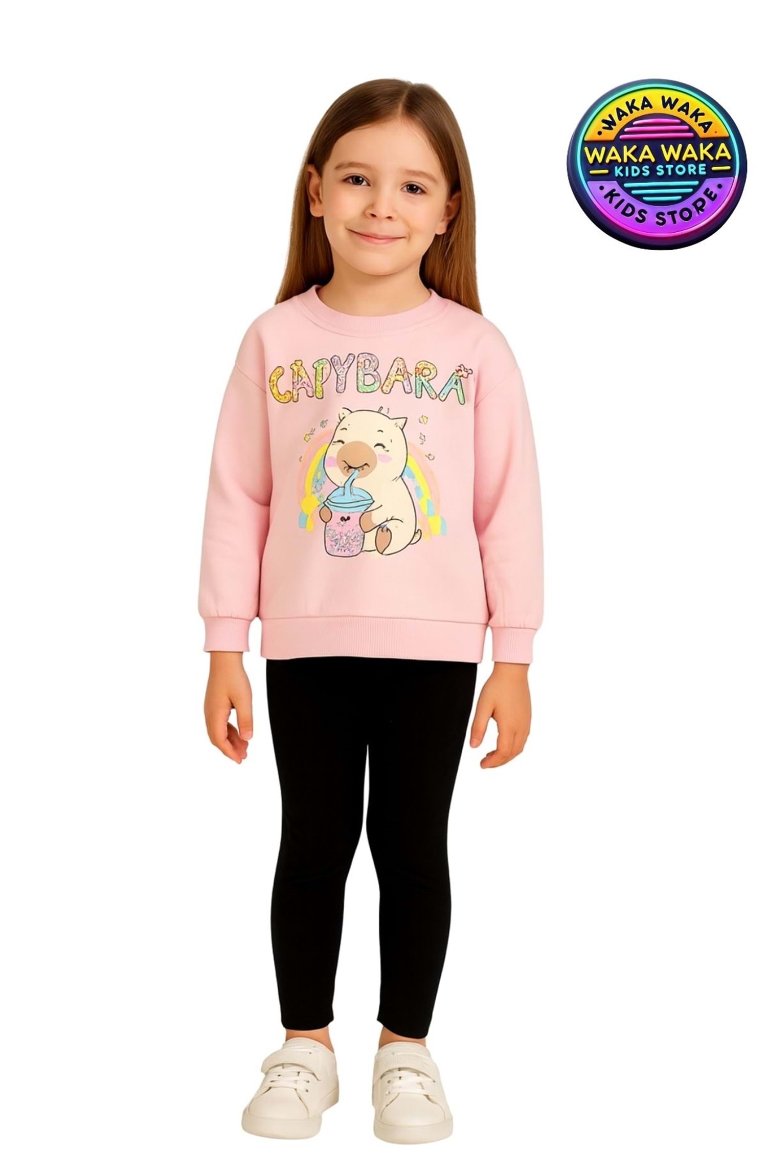 ?? Pembe sweatshirt: Sevimli Capybara baskısı, pastel tonları ve bisiklet yaka detayıyla öne çıkar.