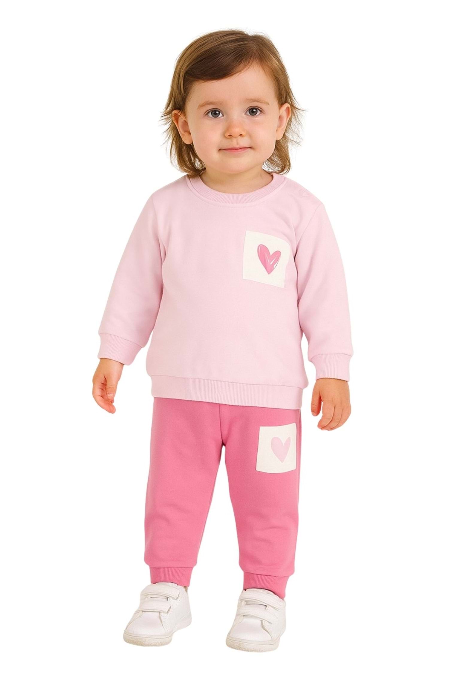 Şirin kalp detaylı tasarımıyla dikkat çeken kız çocuk eşofman takımı, pembe ve ekru renk seçenekleriyle miniklere hem şıklık hem de konfor sunar. Yumuşak kumaşı sayesinde gün boyu rahatlık sağlarken, nefes alabilen yapısı terlemeyi önler. Anaokulu, oyun zamanı ve günlük kullanım için ideal olan bu takım, esnek bel yapısı ve ribanalı paçalarıyla hareket özgürlüğü sunar.Sevimli ve rahat! Pembe ve ekru renkli kalp detaylı kız çocuk eşofman takımı, hem şık görünümü hem de yumuşacık kumaşıyla çocuğunuza gün boyu konfor sağlar. Esnek bel yapısı ve rahat kalıbıyla hareket özgürlüğü sunar. Kolay yıkanabilir, uzun süre formunu korur. Çocuğunuzun en sevdiği günlük kombinlerinden biri olacak!Pembe ve ekru renk seçenekleriyle kalp baskılı kız çocuk eşofman takımı. 2-6 yaş arası minikler için rahat kalıp, yumuşak kumaş ve sevimli tasarım. Günlük kullanım, anaokulu ve oyun için ideal.kız çocuk eşofman takımı