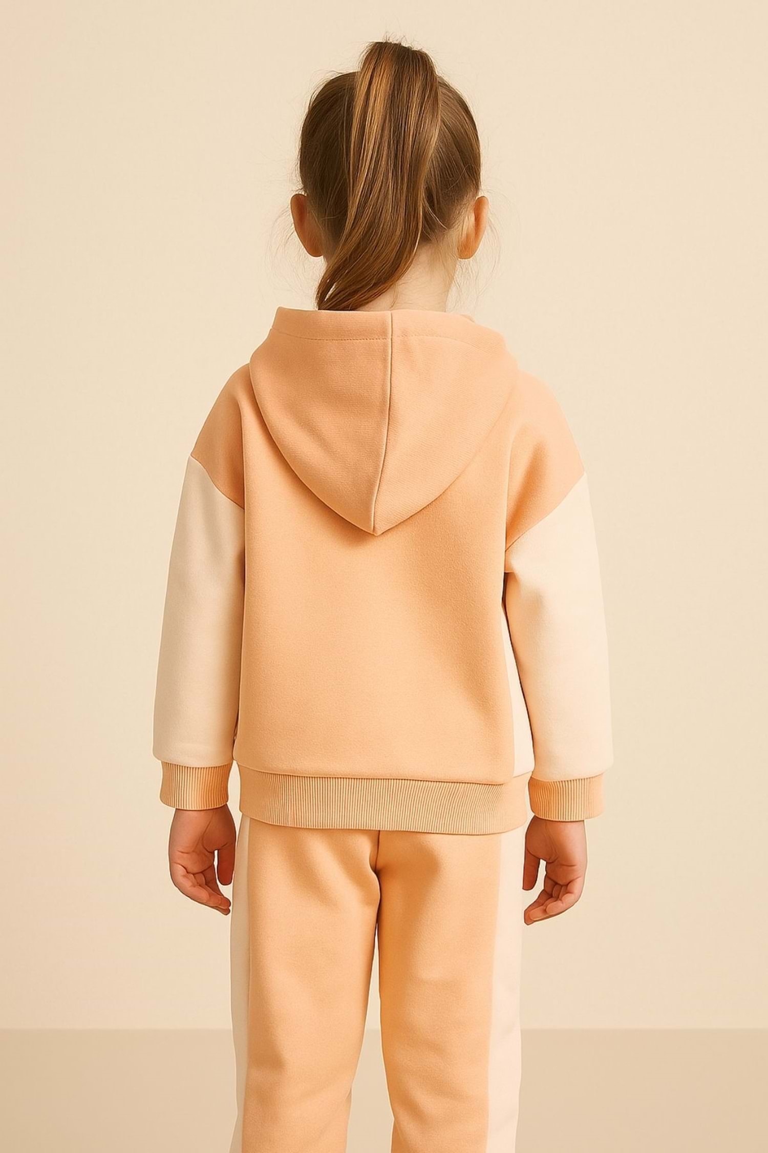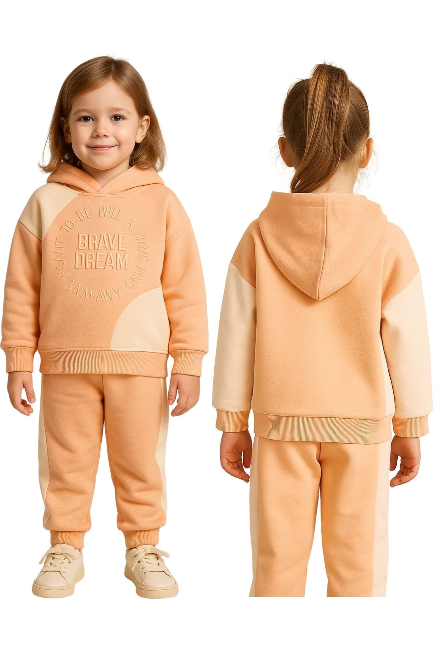 Kız Çocuk Taş Detaylı Los Angeles Baskılı Kapüşonlu Eşofman Takımı Ekru & Pembe Renk Seçenekleri