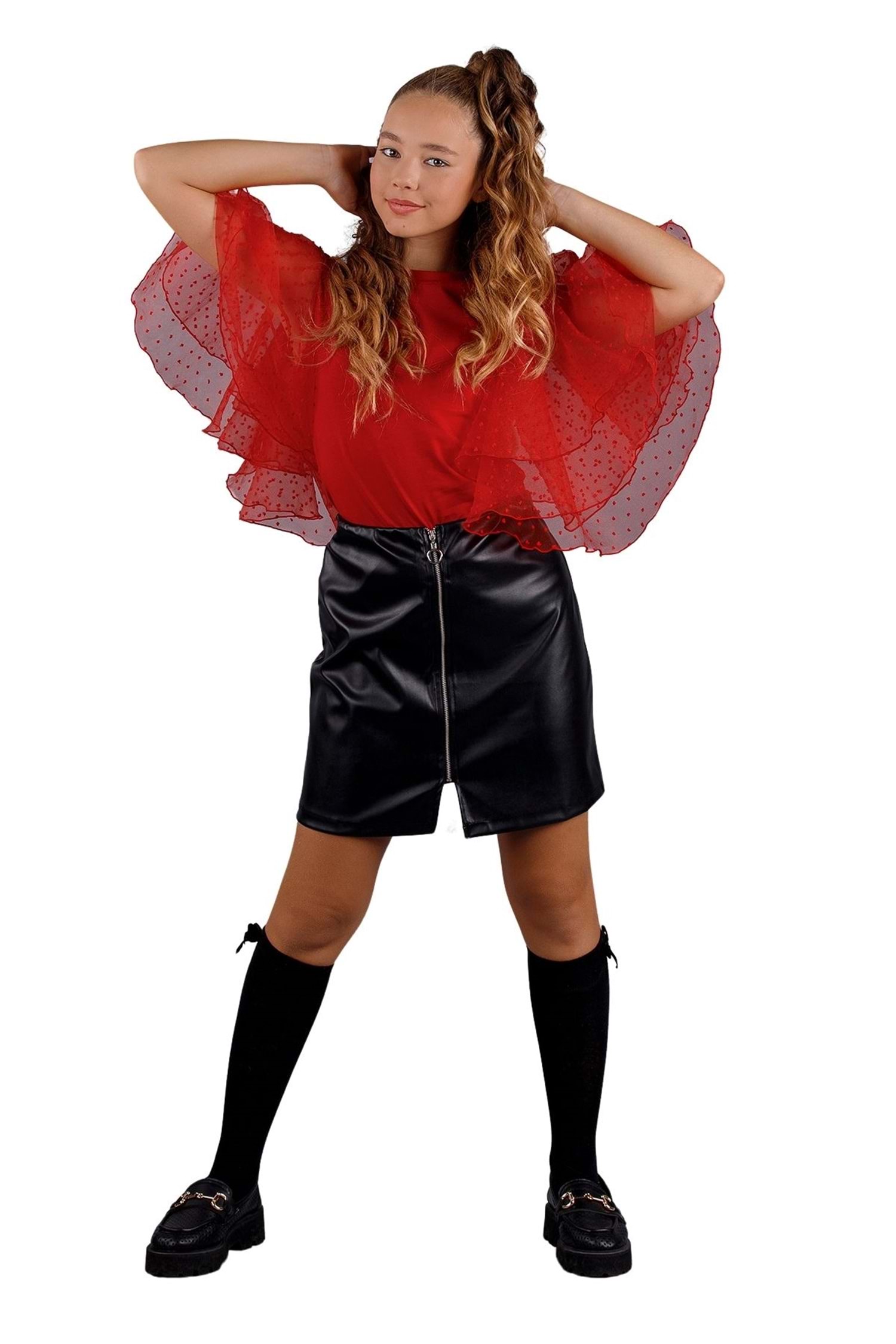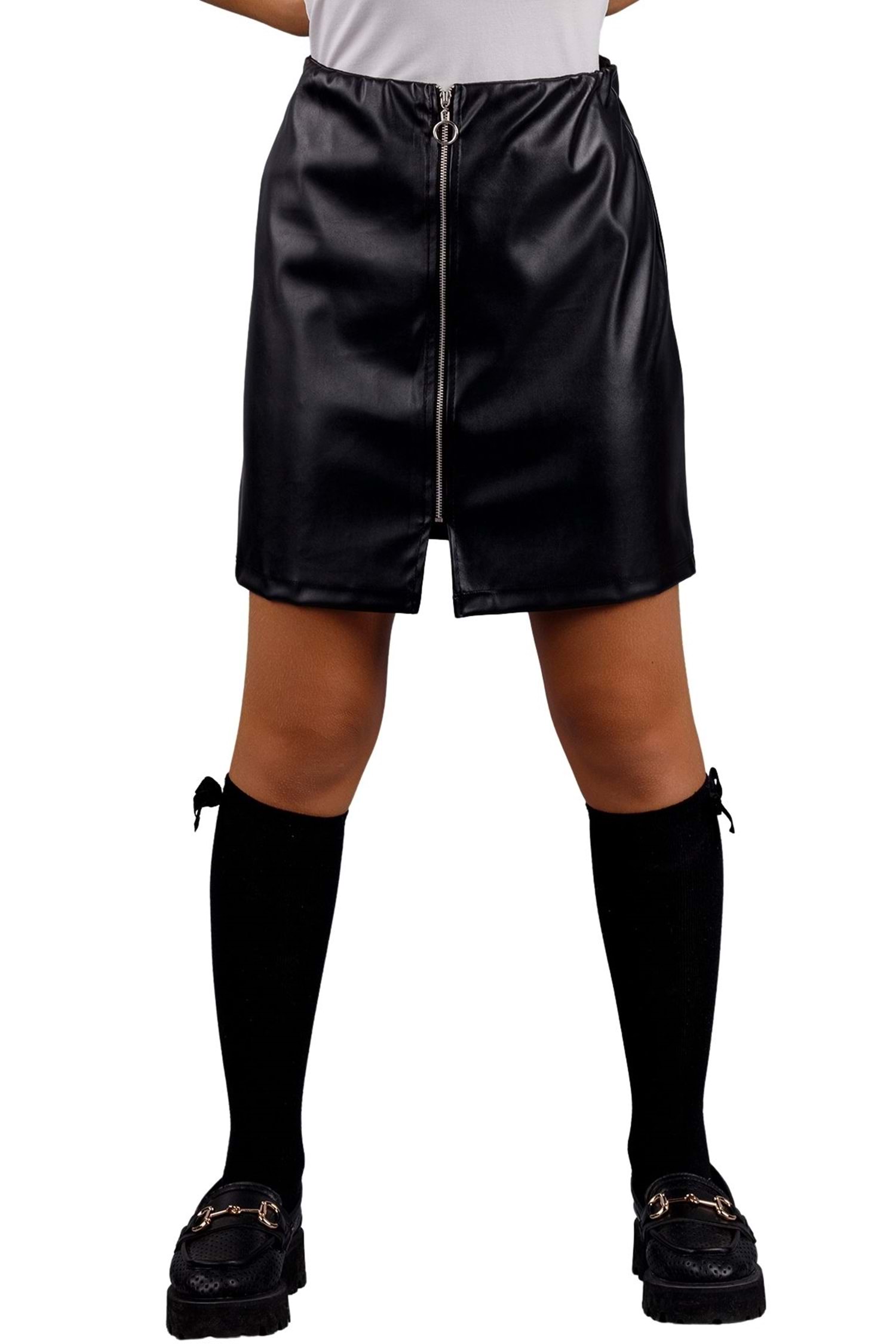 Önü fermuar kapamalı, beli lastikli kız çocuk deri etek, her kız çocuğunun gardırobunda olması gereken bir parçadır.
