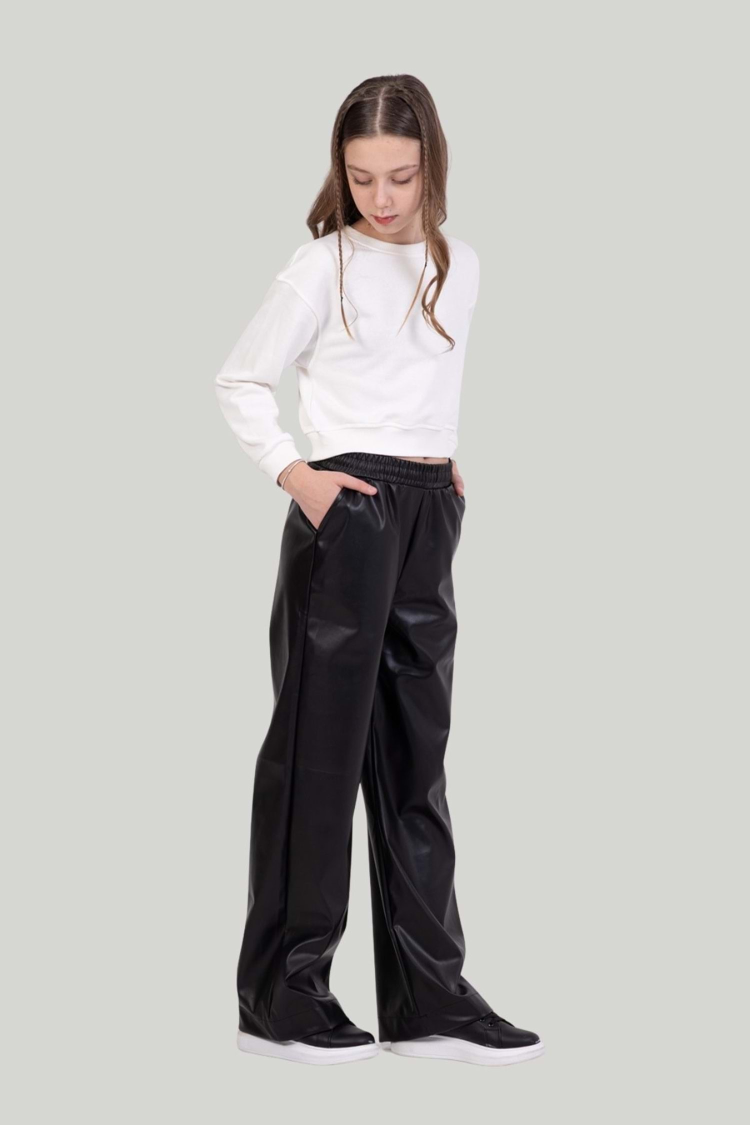 Trendleri yakından takip eden minikler için özel olarak tasarlanan bu siyah deri görünümlü geniş paça pantolon, modern tarzı ve rahat kalıbıyla dikkat çekiyor.