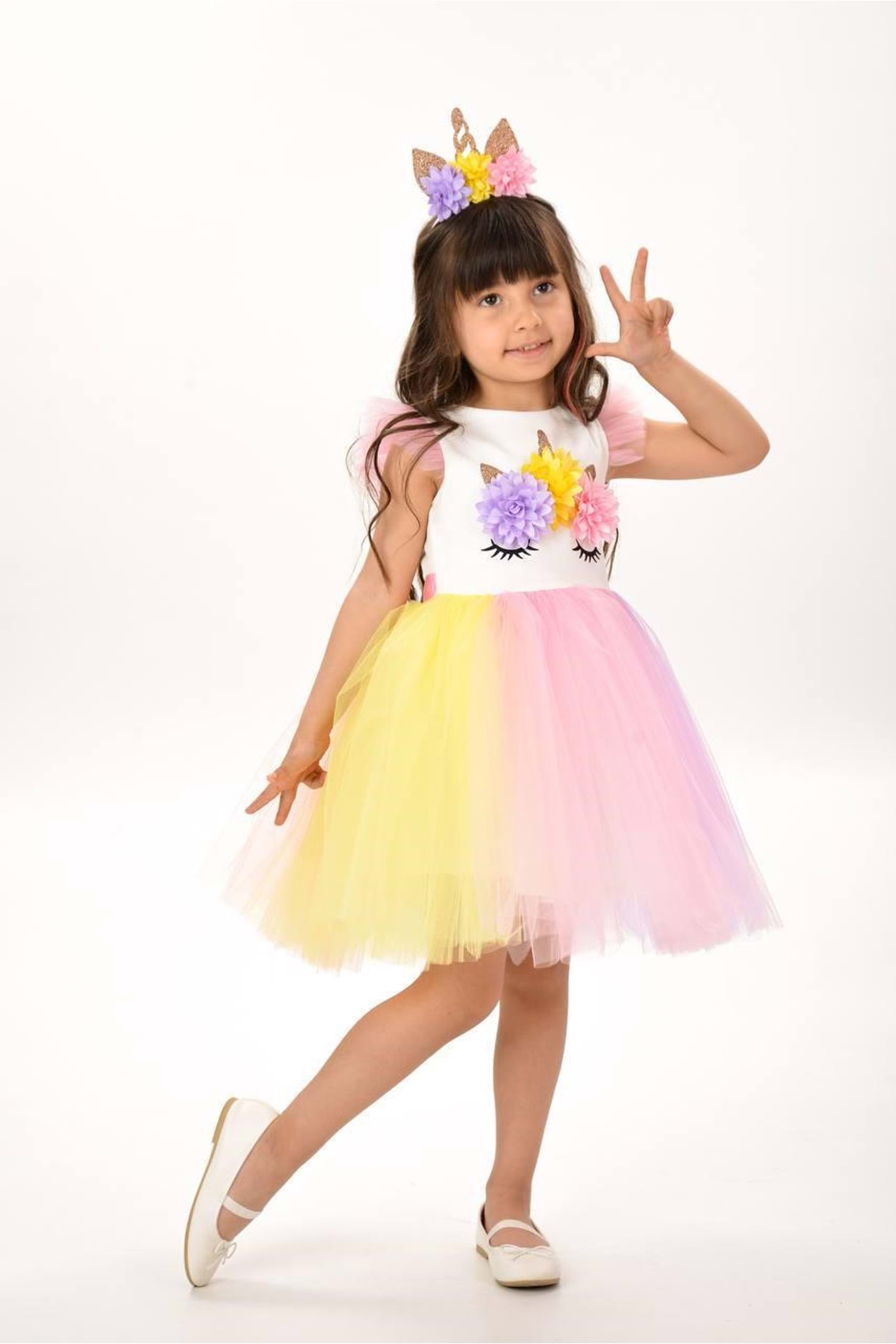 Unicorn Taçlı Rengarenk Kız Çocuk Parti Elbisesi: Küçük Prensesler İçin Sihirli Bir Dokunuş