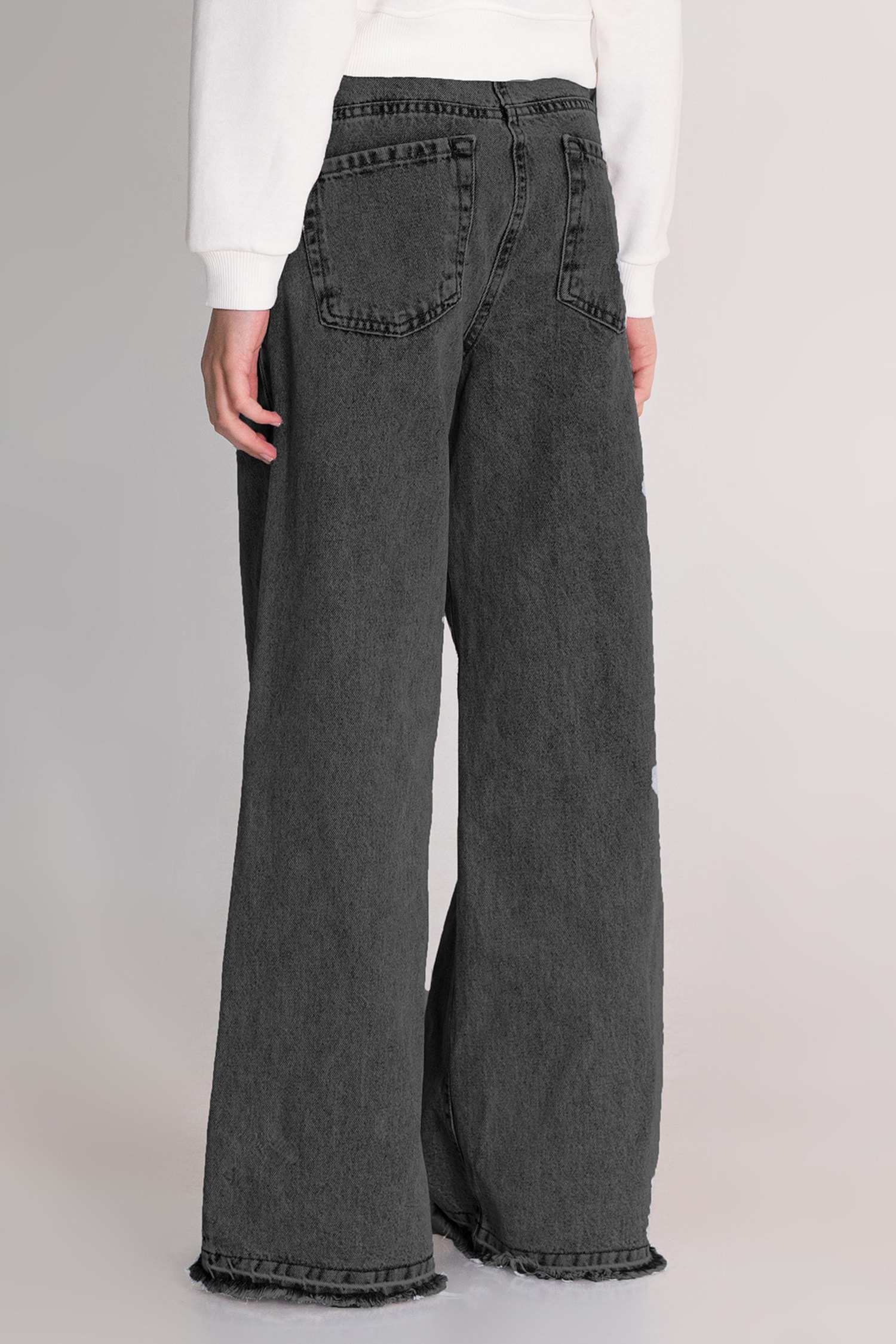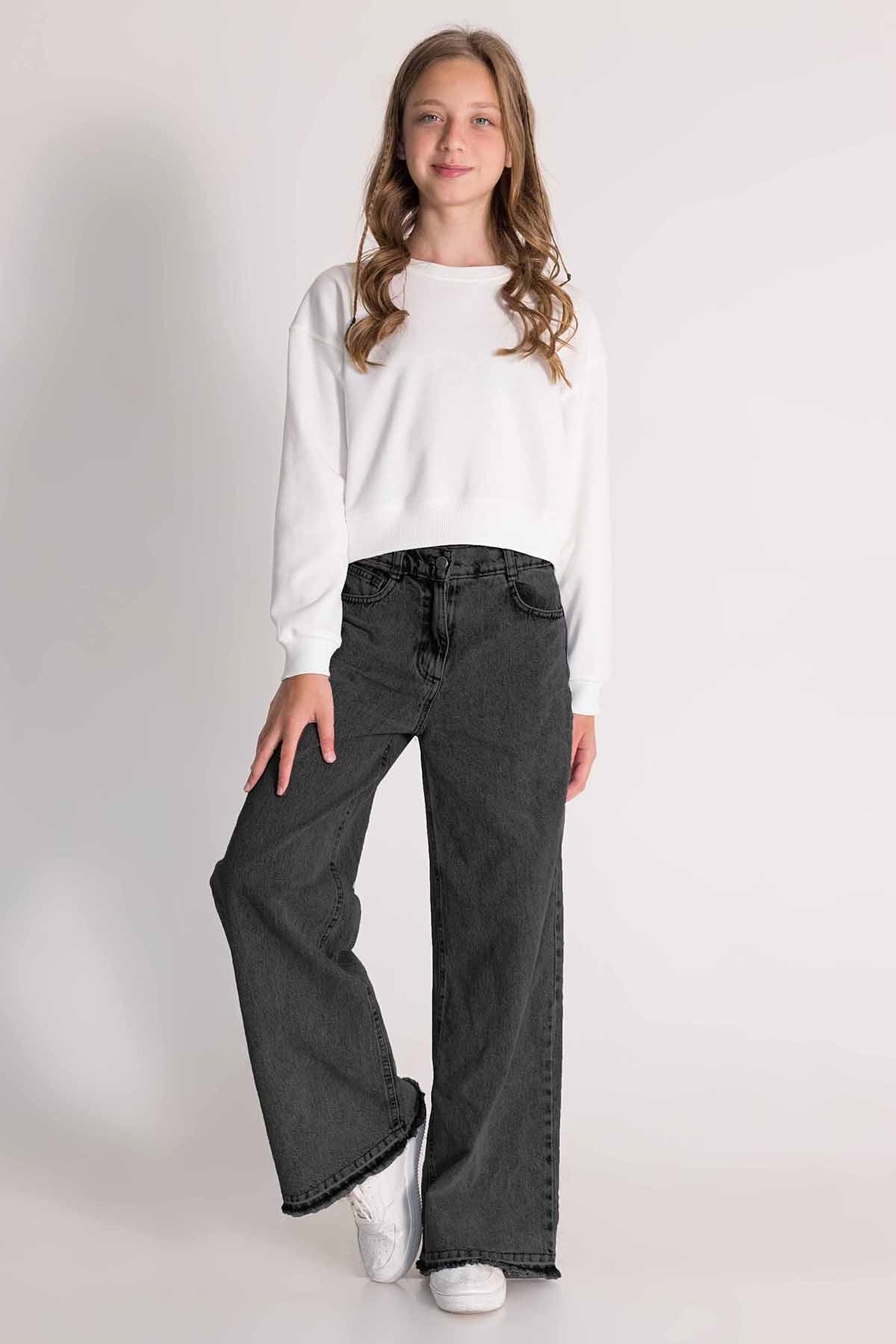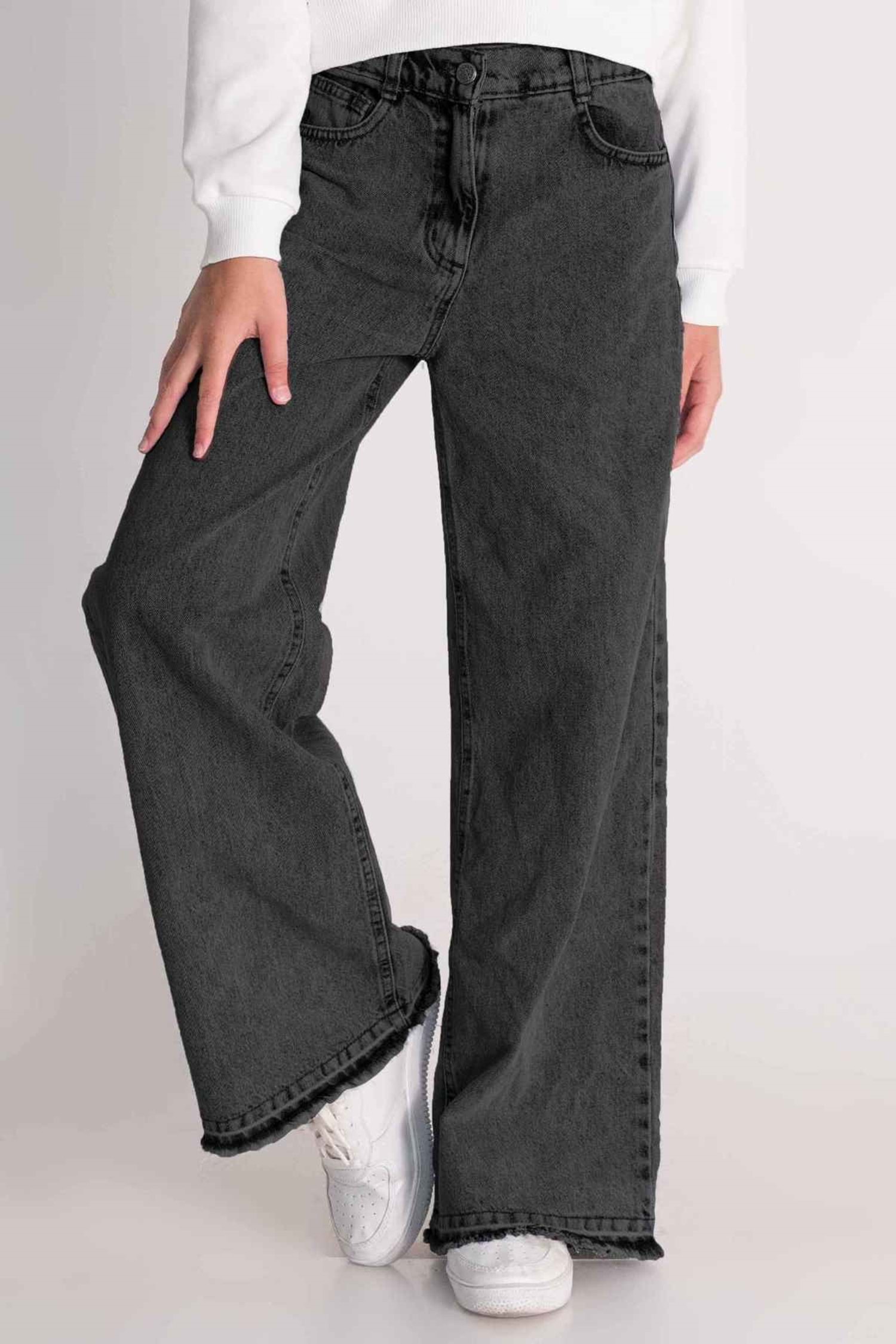 Taş Baskılı Geniş Paça Ayarlanabilir Belli Kız Çocuk Kot Pantolon - Siyah