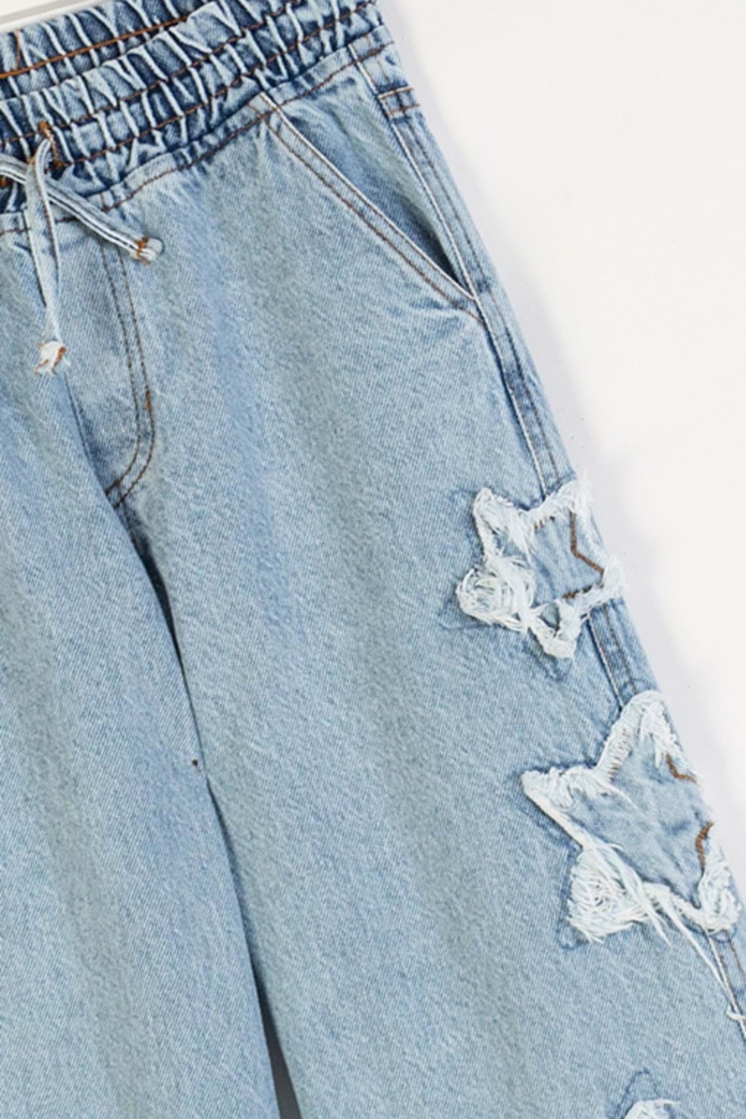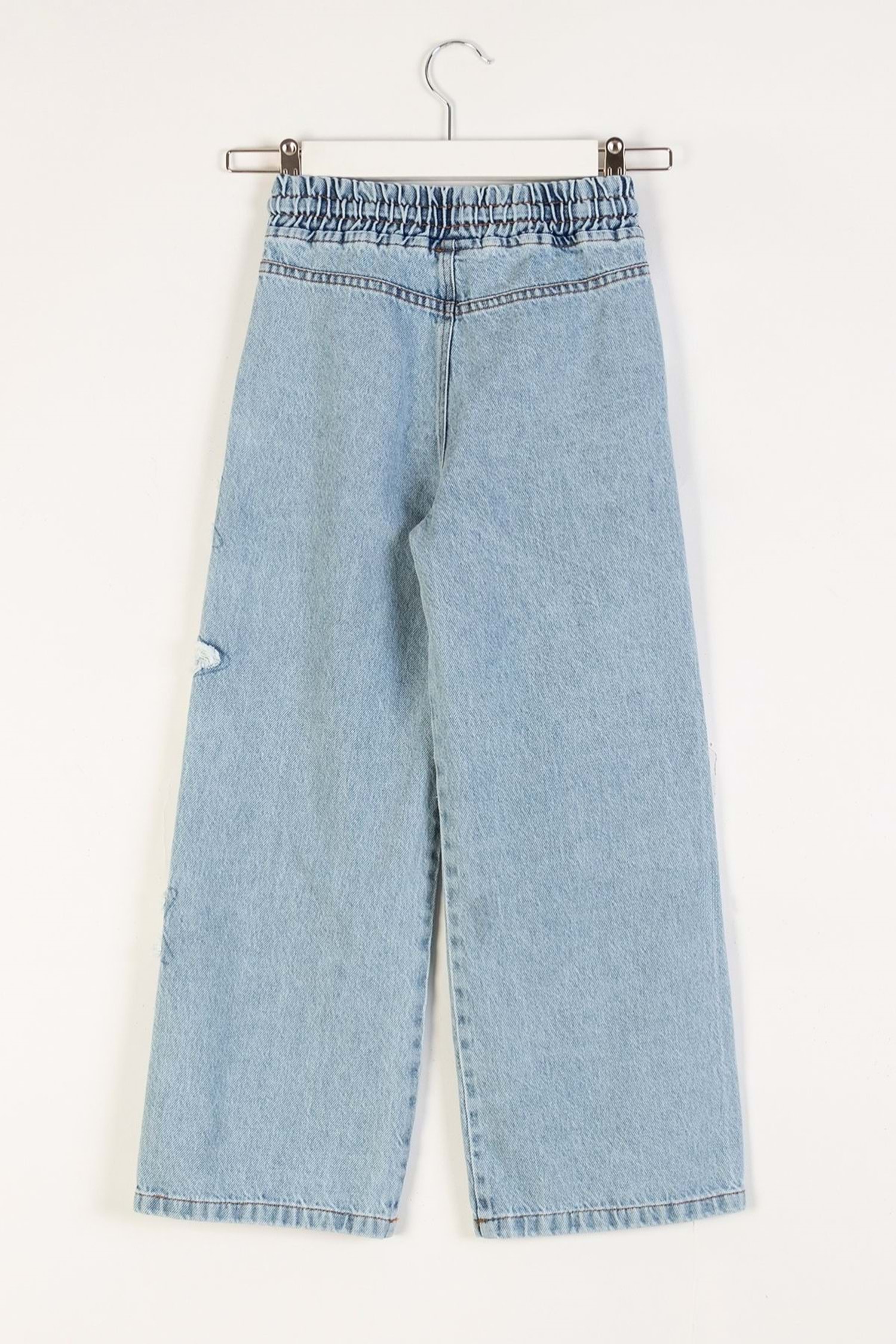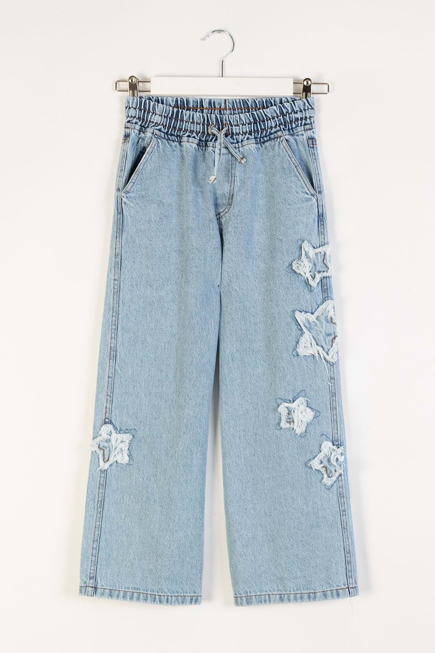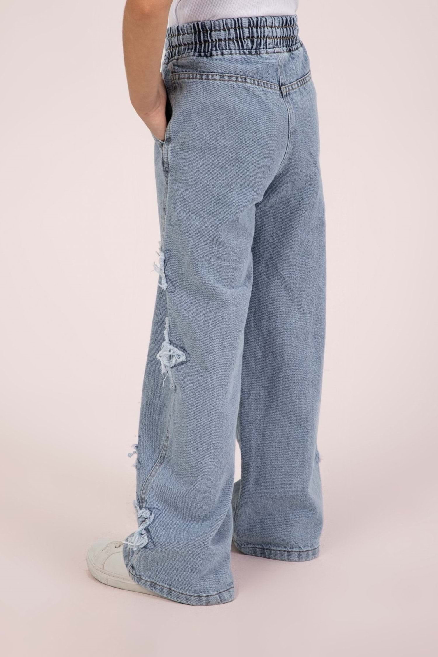 Beli Lastikli Yüksek Bol Paça Wide Leg Yıldız Nakışlı Kız Çocuk Kot Pantolon