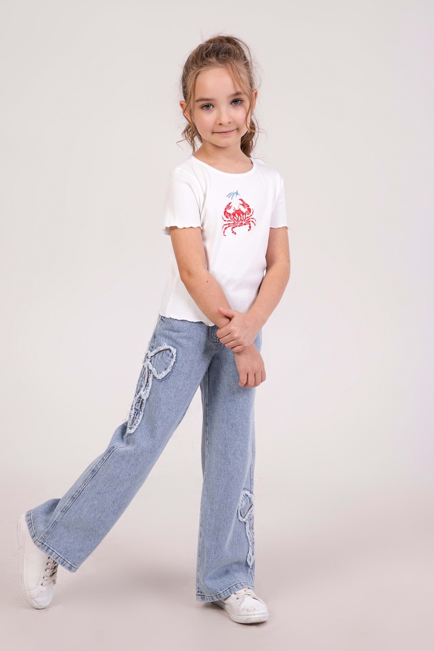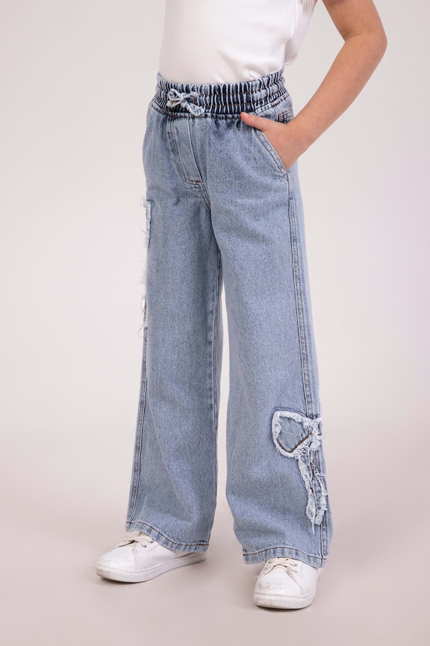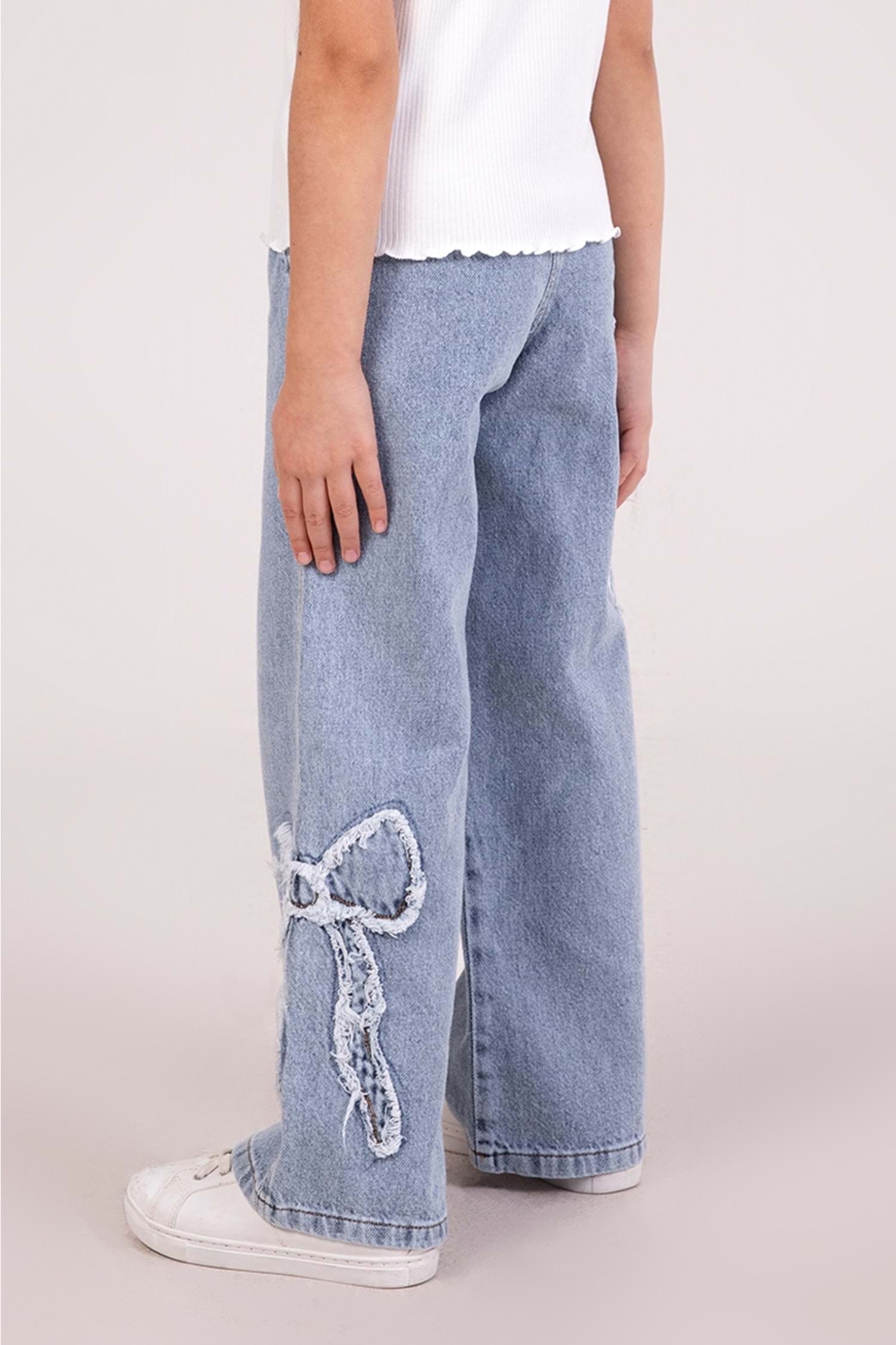 Minik stil ikonlarına özel tasarlanmış bu kurdele nakışlı yumuşak dokulu wide leg kot pantolonile şıklık ve konfor bir arada!