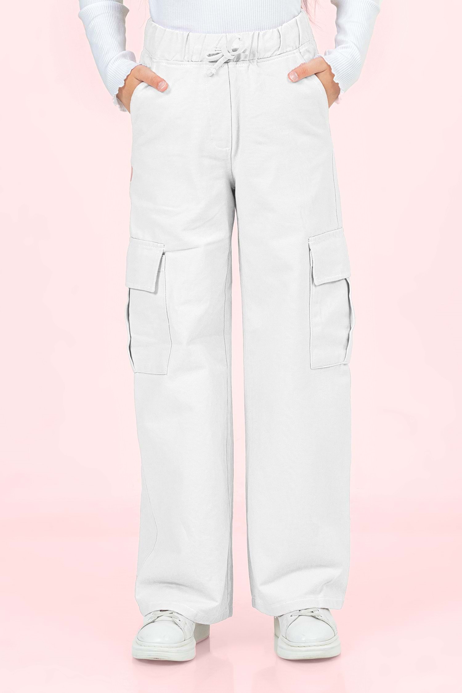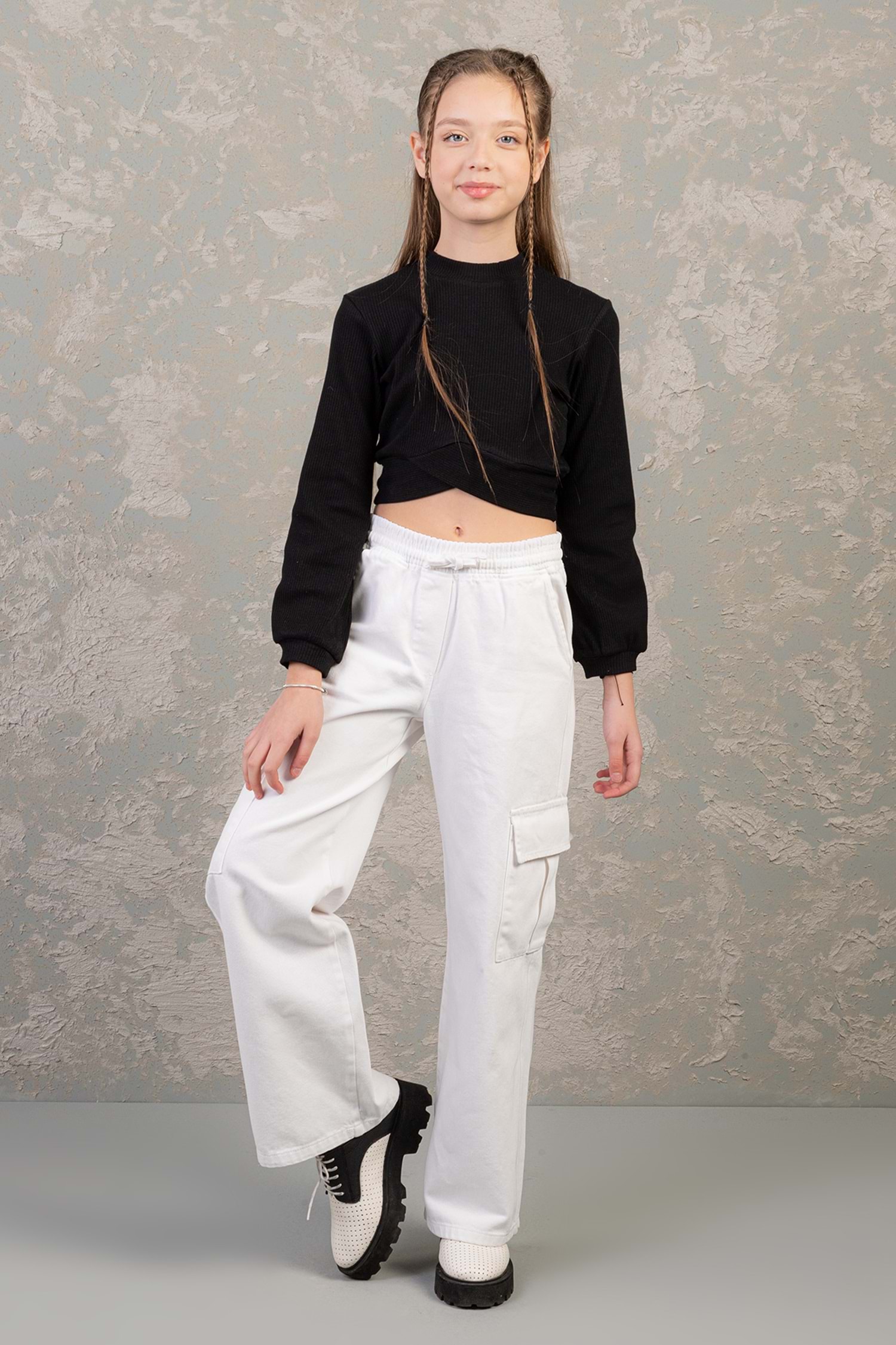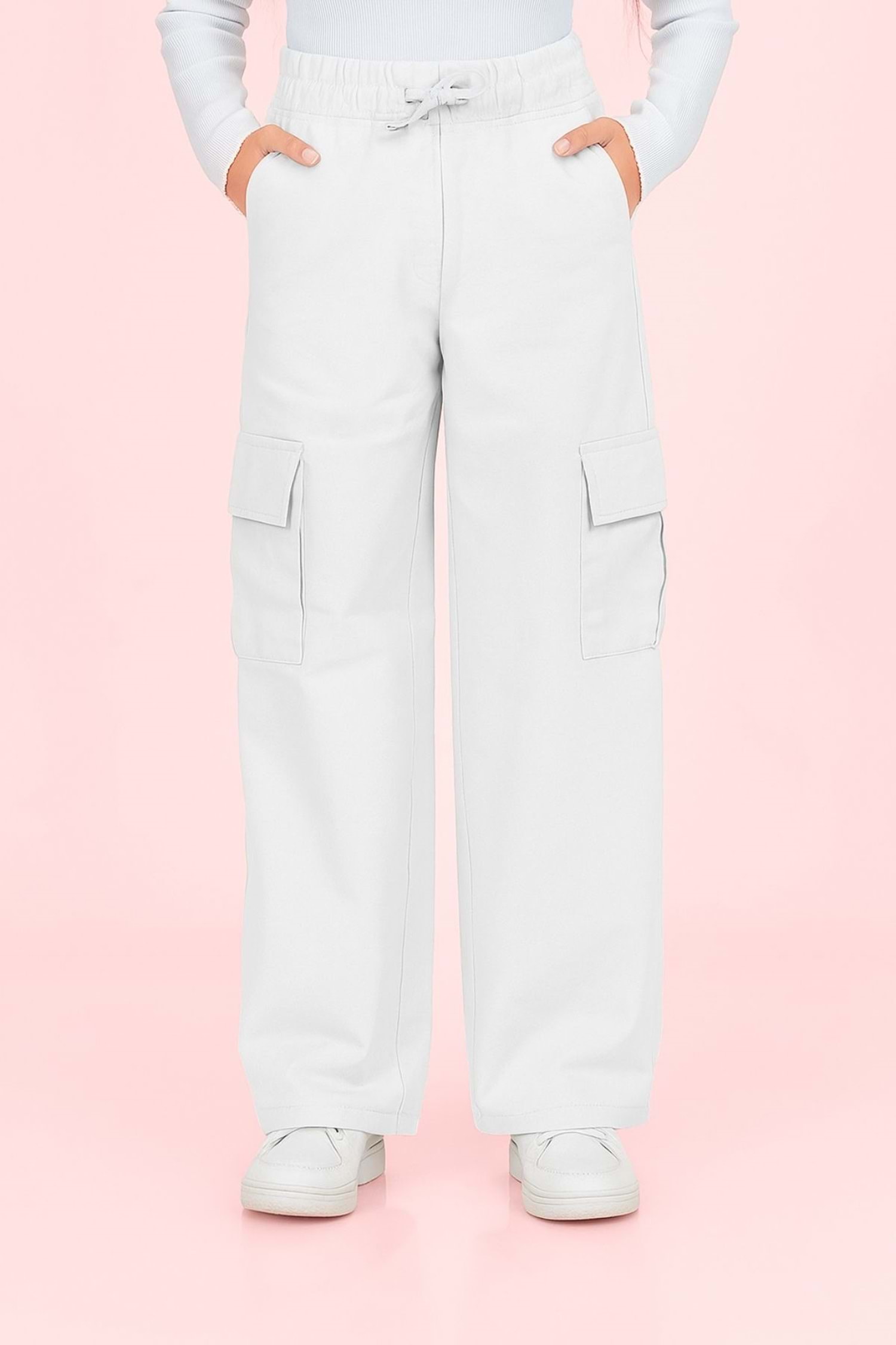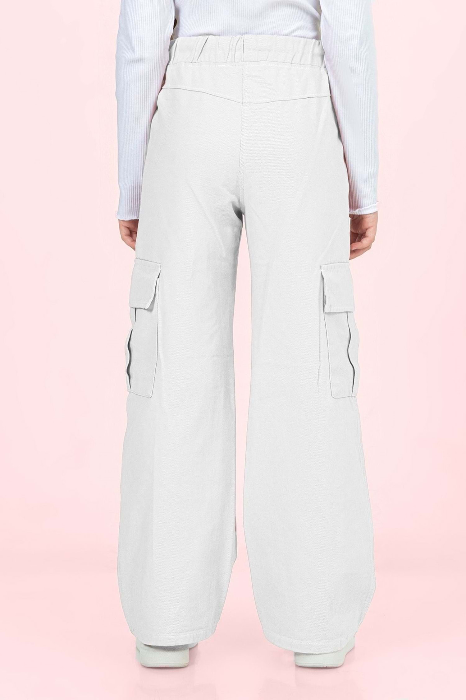 Kız çocuklar için tasarlanan beyaz kargo cep detaylı geniş paça günlük kullanımda hem konfor hem de şıklığı bir arada sunar. Yumuşak kumaş yapısı sayesinde gün boyu rahatlık sağlar. Bel kısmındaki ayarlanabilir lastik ve bağcık detayı ile vücuda uyumlu bir kullanım sunar. Yanlardaki kargo cep detayları modern bir görünüm kazandırırken aynı zamanda işlevsellik sağlar.