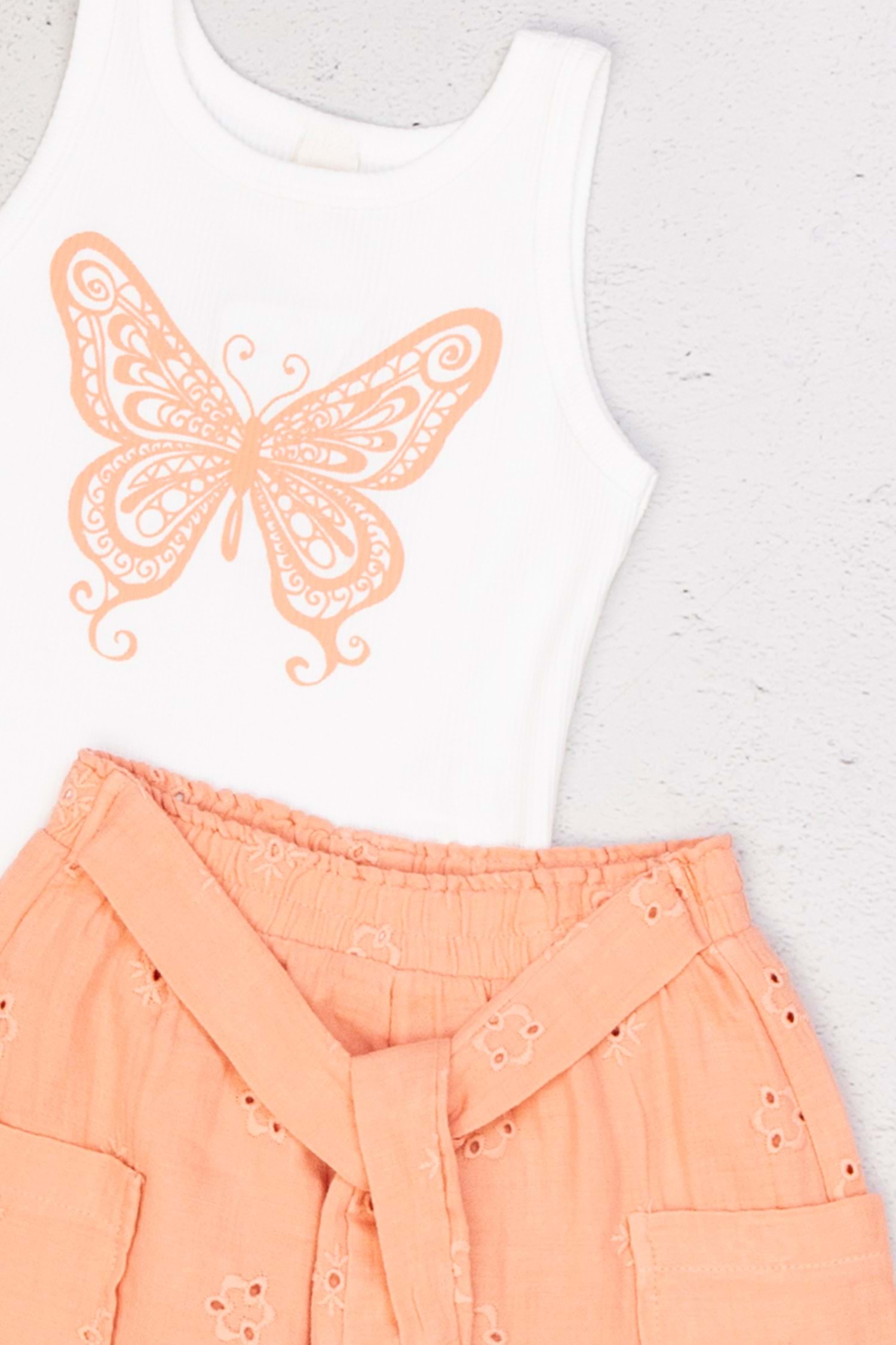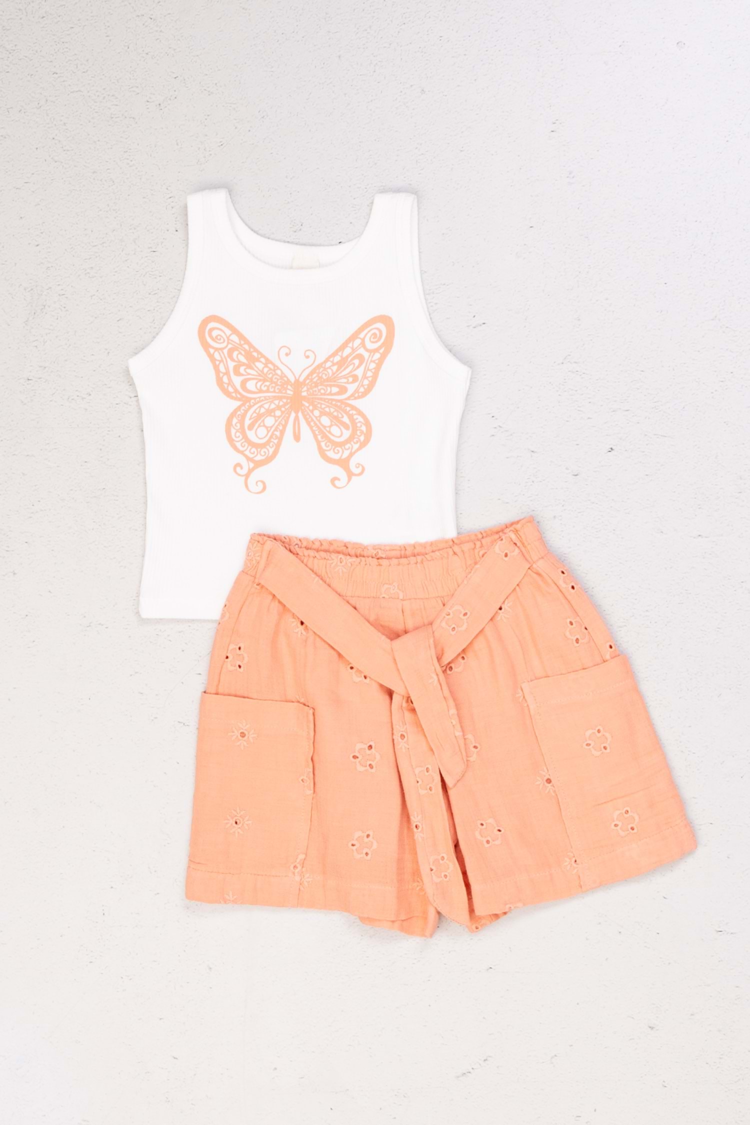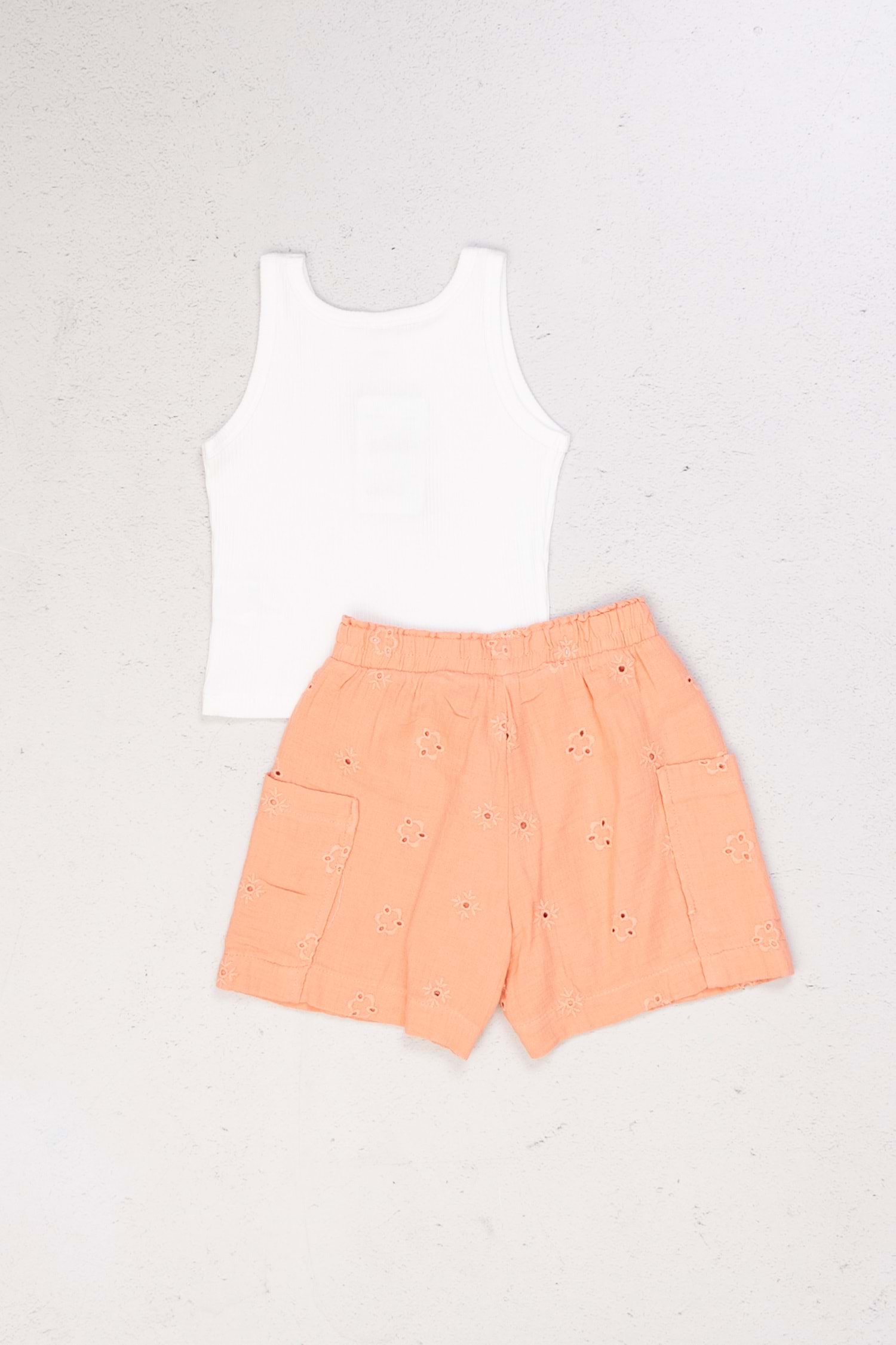 Kızınızın tarzına ve zevkine hitap edecek şık ve rahat bir kıyafet arıyorsanız, kabartma baskılı askılı badili nakış işlemeli şortlu kız çocuk takımları tam size göre!