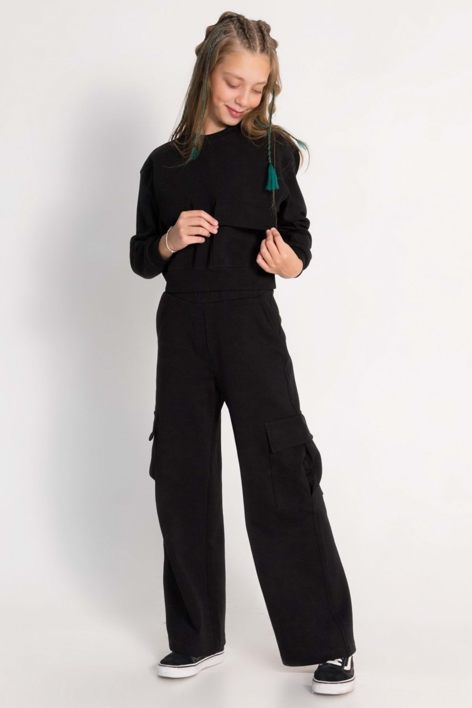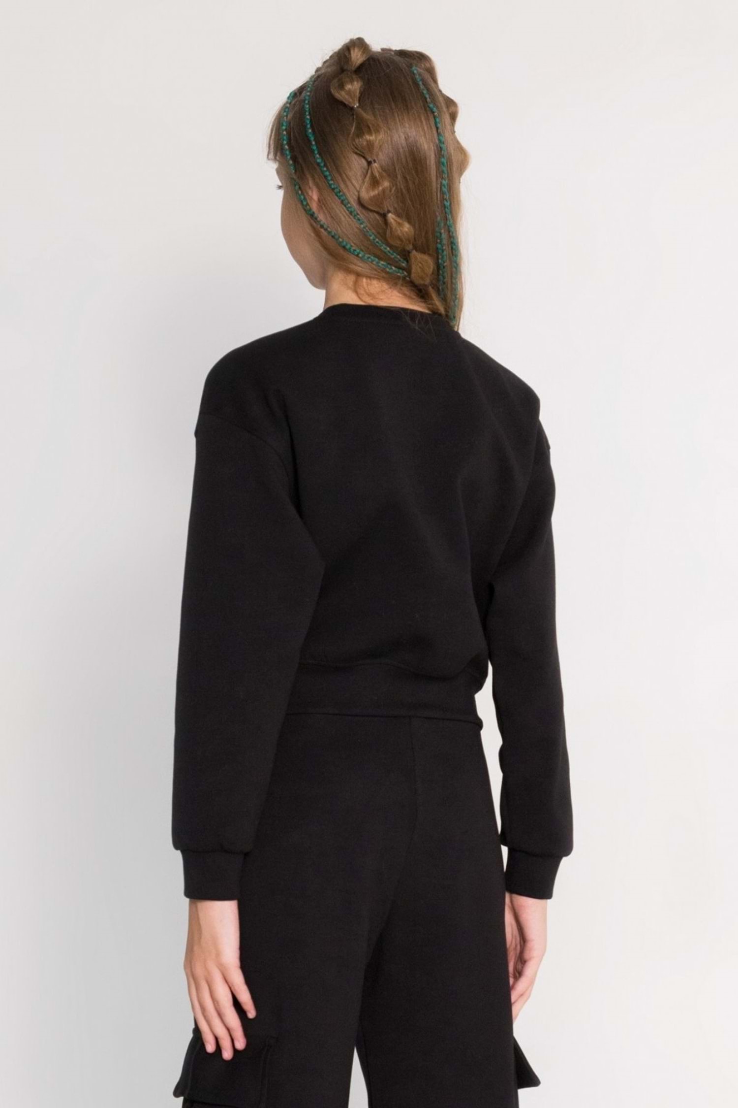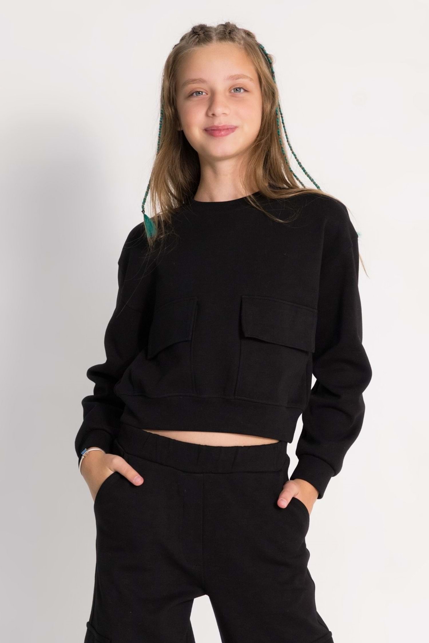 Minik modacıların yeni favorisi! Kapak cepli detayıyla hem şık hem de kullanışlı olan bu krop sweatshirt, beli ribanalı tasarımıyla da rahat bir uyum sunuyor. Düz rengi sayesinde her kombinle kolayca eşleşir. Kızınızın gardırobunda mutlaka bulunması gereken temel parçalardan biri.