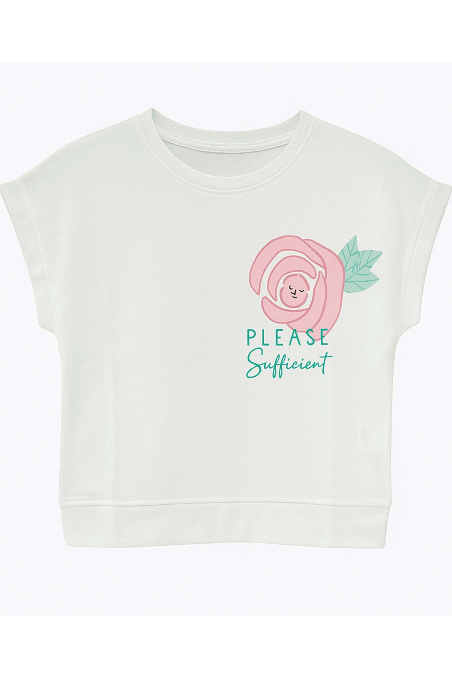 Tişörtün hem önünde hem de arkasında çeşitli çiçek desenleri bulunur.