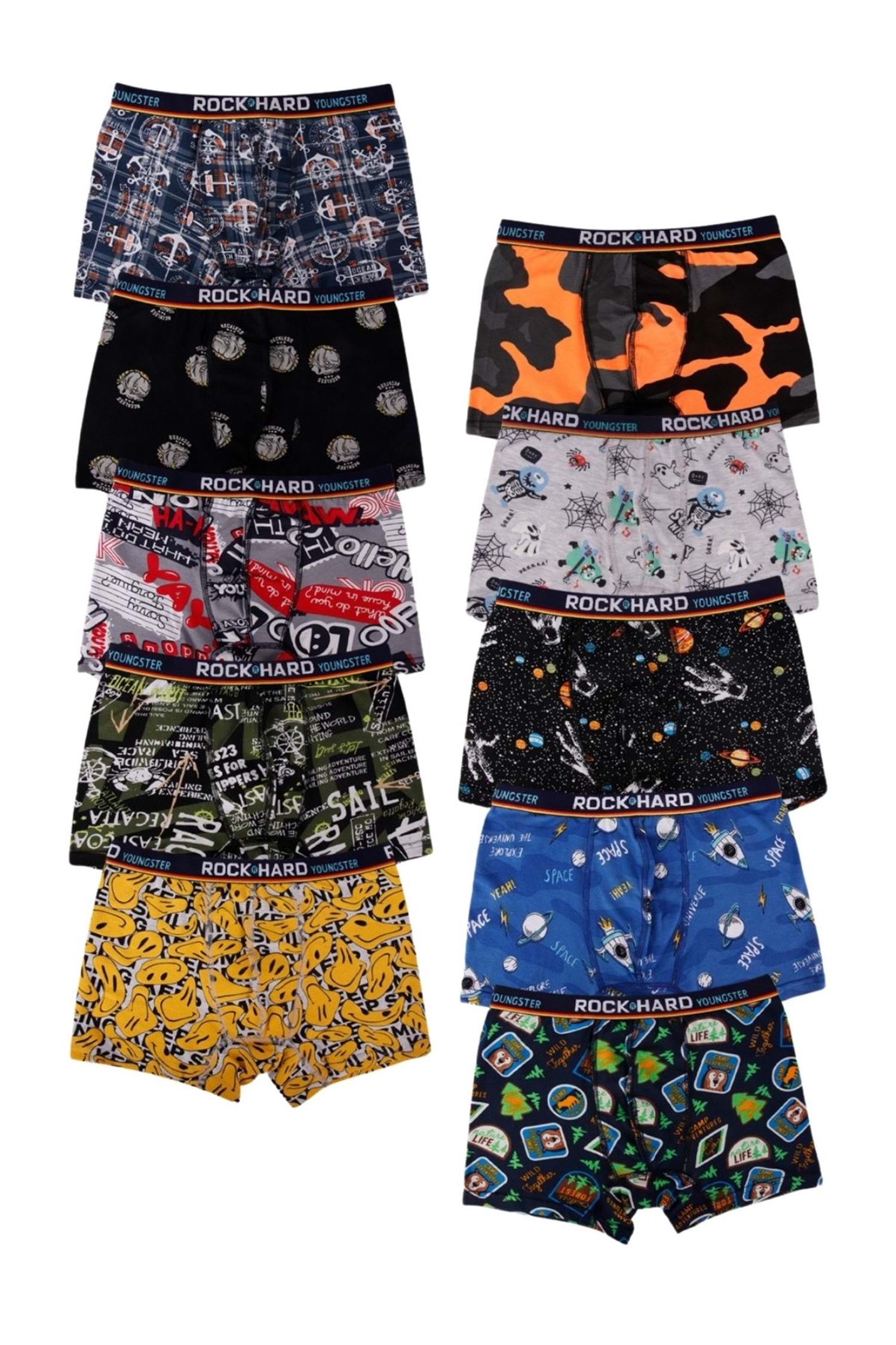 Rock Hard, erkek çocukları için özel olarak tasarlanmış, farklı ve eğlenceli desenlere sahip boxerlarıyla öne çıkıyor. Kaliteli kumaşları ve canlı renkleriyle çocukların hem rahat etmesini hem de tarz sahibi olmasını sağlıyor.